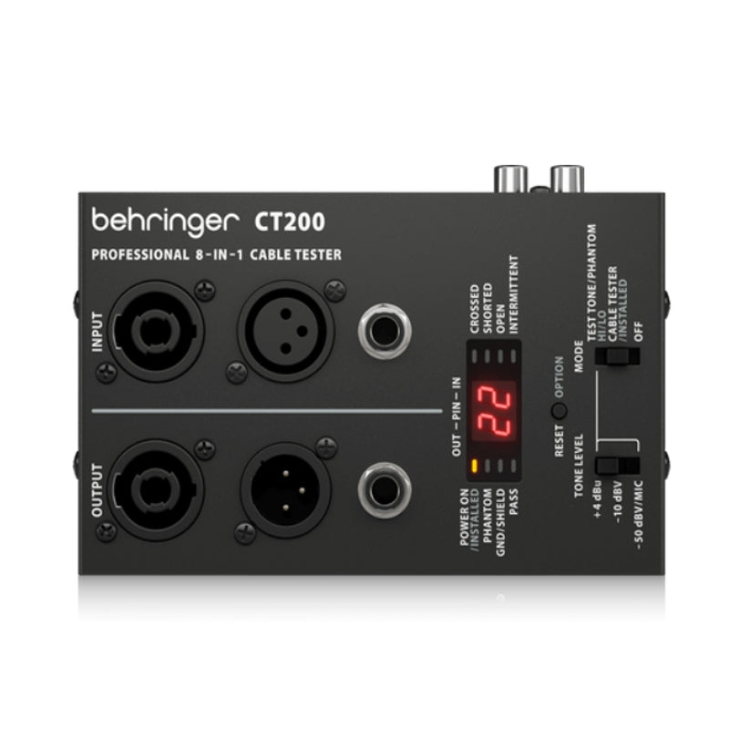 Microprocessor-Controlled 8-in-1 Cable Tester Behringer's CT200 cable tester is an absolute must-have in your studio or live-sound toolbox. This super-affordable 8-in-1 cable tester lets you diagnose common problems in a wide range of cable types. On the audio side, the CT200 lets you check for faults and shorts in cables with XLR, speak ON, 1/4" and 1/8" TRS, and RCA connectors. The CT200 can check for continuity, intermittent or shorted connections, the presence of phantom power and grounded shields. Because this handy tool runs on two AA batteries, you can carry it in your pocket and be ready to troubleshoot at a moment’s notice. Features: A quality cable tester for your studio or live toolbox Checks XLR, speak ON, 1/4"" and 1/8"" TRS, and RCA audio cables Includes phantom power and ground shield diagnosis Tests RJ45 (Ethernet), MIDI, and USB data cables for continuity...