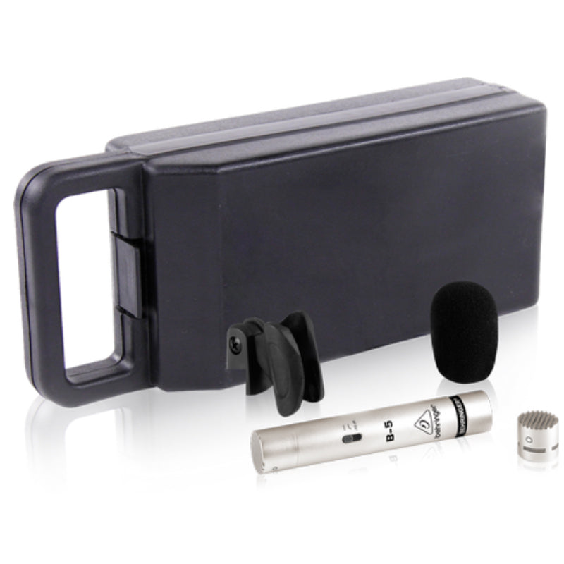 Gold-Sputtered Diaphragm Studio Condenser Microphone with 2 Interchangeable Capsules The Behringer B-5 Gold-Sputtered Diaphragm Studio Condenser Microphone features two interchangeable capsules that offer cardioid and omnidirectional polar patterns. This flexible design results in high-quality signal reproduction when capturing both vocals and instruments. The cardioid capsule provides maximum rejection of off-axis audio and ambiance, minimizing room noise and feedback. The omnidirectional capsule provides a generous pickup with uniform frequency response throughout. There is a -10 dB pad switch and low-frequency roll-off for suppressing low-frequency hum, rumble, and wind noise. The B-5 is suitable for capturing vocals, drum overheads, guitars, and similar instruments. The package includes a microphone stand adapter, a windscreen, and a carrying case. Features: Professional gold-sputtered diaphragm condenser microphone for unsurpassed audio quality With exchange capsule (1x cardioid and 1x omnidirectional) Gold-plated XLR connector Accessories: clamp, wind shield, case 48 V Phantom power required Pressure-gradient transducer with shock-mounted gold-sputtered diaphragm capsule...