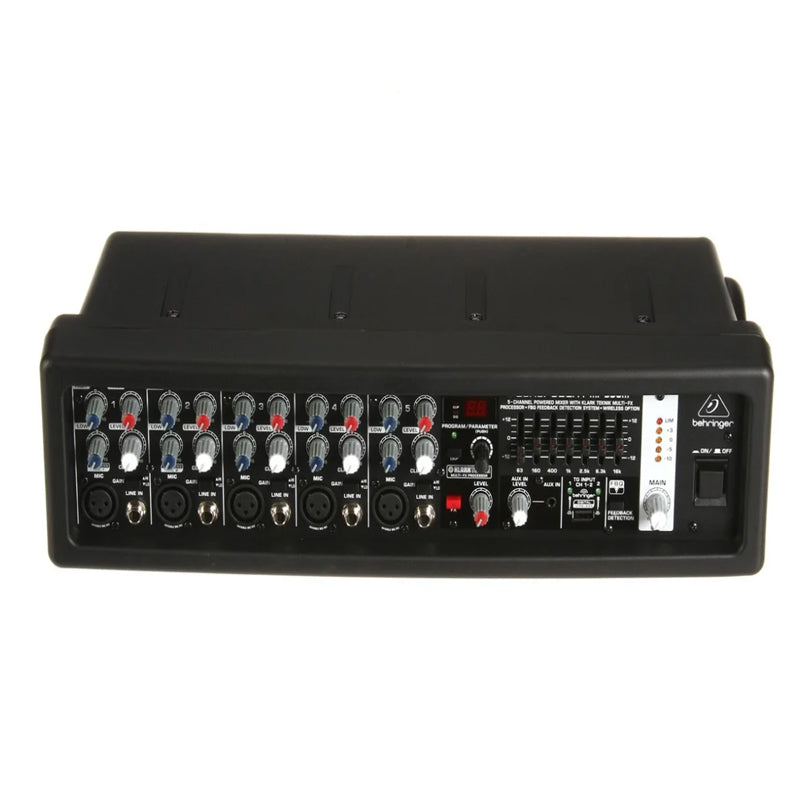 500W 5-Channel Powered Mixer with Klark Teknik Multi-FX Processor, FBQ Feedback Detection System and Wireless Option Behringer Europower PMP550M powered mixer with effects. This mono 500W powered mixer gives you 5 mono channels with mic pres and an additional aux stereo RCA input. The built-in FX processor gives you 25 effects presets including delays, reverbs, chorus, and more. KLARK TEKNIK is recognized worldwide as one of the most prestigious British audio companies, with a 40-year pedigree and even a TEC Lifetime Achievement Award to back it up. The Company has designed and manufactured products for world-class artists, and their legendary DN780 reverb processor is considered by leading audio engineers around the world as the industry standard. Check out their website to learn more about KLARK TEKNIK's legendary heritage. BEHRINGER is proud to incorporate custom-engineered KLARK TEKNIK effects into their products. Featuring 100 world-class presets to choose from including reverb, chorus, flange, delay, pitch shift and many other amazing effects, KLARK TEKNIK created the 24-bit, studio-grade effects engine for BEHRINGER to give your performance that truly professional finishing touch. Features: Ultra-compact 500-Watt powered mixer Revolutionary Class-D amplifier technology: enormous power, incredible sonic performance and super-light weight Ultra-high quality Klark Teknik FX processor with 25 presets including reverb, chorus, flanger, delay, pitch shifter and various multi-effects ""Wireless-ready"" for high-quality Behringer digital wireless system (not included) 5-channel mixer section features 5 mic/line channels plus separate Aux input...