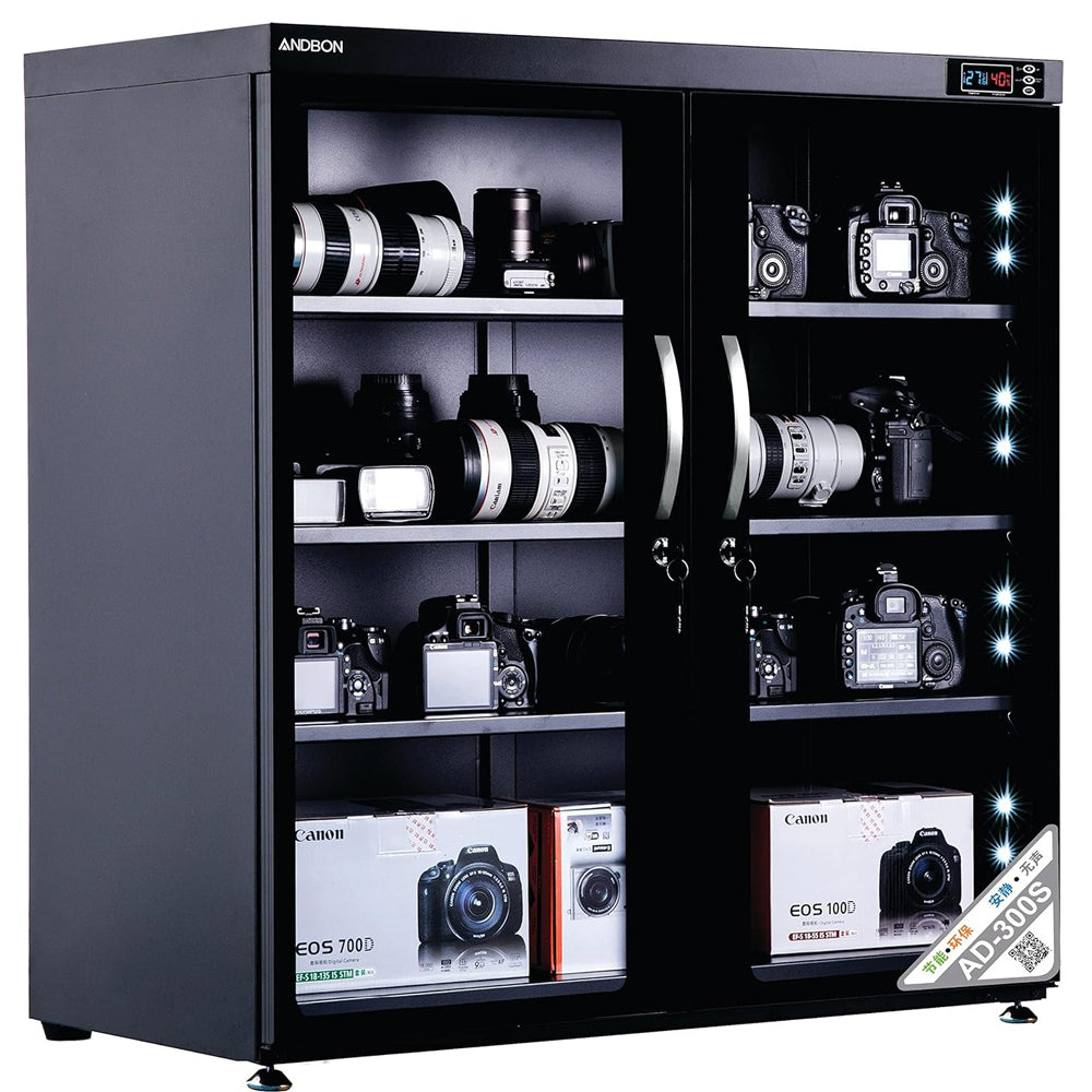 Protect your lenses, photographic and optical equipment, mobile electronics, and other valuable accessories from excessive moisture, dirt, and dust with the Andbon AD-300S Electronic Dry Cabinet. DESCRIPTION: AD-300S Electric dry cabinet with digital controls and LED indicator display Digital control allows you to automatically adjust the humidity of the air. Serves to store cameras, medicines, documents, and other items that need to be stored in dry conditions (so they don't get moldy). Equipped with LED lights on the inside to illuminate objects in the dry cabinet Equipped with brake wheel for easy adjustment of dry cabinet position Fully-featured, the cabinet has a lockable, rubber-sealed glass door, with two keys, and a front metal handle. A large, dimmable LCD displays ambient temperature (in Fahrenheit or Celsius), relative humidity, and other settings. Interior LED lights make viewing and finding gear easier, and both the base and the adjustable steel shelf is padded to help guard against scratches. The Electronic Dry Cabinet is powered by an included multi-voltage power supply. In addition to being near silent, without a fan or compressor to make noise, the unit is also dripless, eliminating the need for a water tray. To prevent unwanted movement, the bottom of the cabinet has four rubber feet and two are leveling feet for installing on uneven surfaces. Features: Digital LCD display Andbon Dry Box Series (25%~60% RH) provides the best moisture damage prevention for aging, molding, spoiling, rusting, corrosion, denaturing, etc. Auto Memory Last RH Setting Slide/Pullable Trays,Anti-Rust Cabinet (special coated paint), Silent Operation...