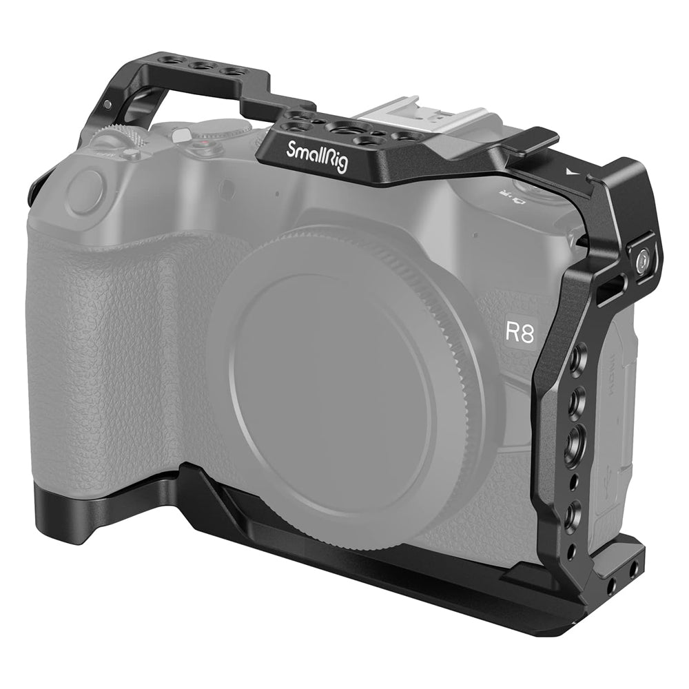 Full Camera Cage for Canon EOS R8 SmallRig Cage for Canon EOS R8 4212 is designed to protect the camera and attach accessories. Locking the camera via one bottom 1/4 "-20 screw and two side lock adapters, the cage comes with rubber pads that prevent scratches and gives full access to buttons, card slots, flip screen, and battery door. Among its accessory mounts, 1/4"-20 threaded holes, 3/8"-16 threaded holes, and ARRI 3/8"-16 locating holes support Top Handle 3765, Side Handle 2093C, Monitor Mount 2903B, and Magic Arm 3875; The top cold shoe mount attaches Microphone 3468, LED Video Light 3286B; and the left NATO rail fits Rotating Side Handle 3260 & 3813. Also, there is a QD socket for a quick-release shoulder strap buckle and a bottom Arca-Swiss quick-release plate for an Arca-type tripod or DJI RS 2 / RSC 2 / RS 3 / RS 3 Pro gimbal for a quick switch between gimbal, handheld and tripod shooting. A screwdriver is included for easy assembly and disassembly. Designer: Yetta White Features: All-in-one cage protects camera; Locks camera via one 1/4"-20 screw at the bottom and two side lock adapters on both sides; For Canon EOS R8 Mirrorless Camera...
