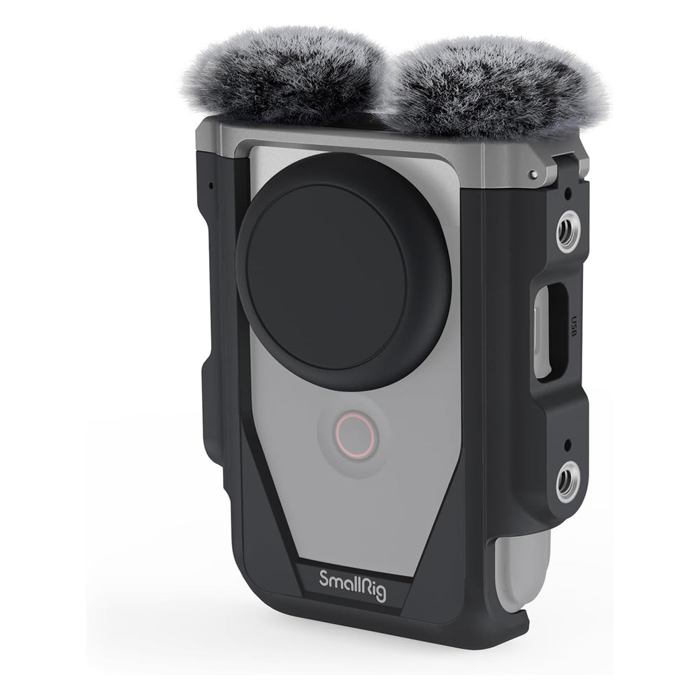 Full Camera Cage Kit for Canon PowerShot V10 SmallRig Cage Kit for Canon PowerShot V10 4235 is designed to protect the camera and attach accessories. It contains two furry windshields, one camera cage, one lens cap and one storage bag. Among them, the windshields magnetically mount onto the top of mounting plates and are made of carefully selected high-quality materials to reduce wind noise by about 20dB for improved recording; the slide-in cage, locked by one click, features built-in silicone cushions for a secure fit; the silicone lens cap protects the lens from scratches; the wear and dirt-resistant polyester storage bag stores the camera and the cage kit altogether; and the cage not only gives full access to controls, interfaces and built-in camera stand but comes with 1/4"-20 threaded holes to attach accessories like a tabletop tripod or the cold shoe adapters (included in the box) for use in live broadcast and vlogging. Designers: Kong, Peiwen He Features: All-around protection; accessory mounts for live broadcast and vlogging Furry windshield reduces wind noise by about 20dB Silicone lens cap prevents scratches Wear and dirt-resistant storage bag Sturdy Cage with Accessory Mounts Furry Windshield Reduces Noise by 20dB...
