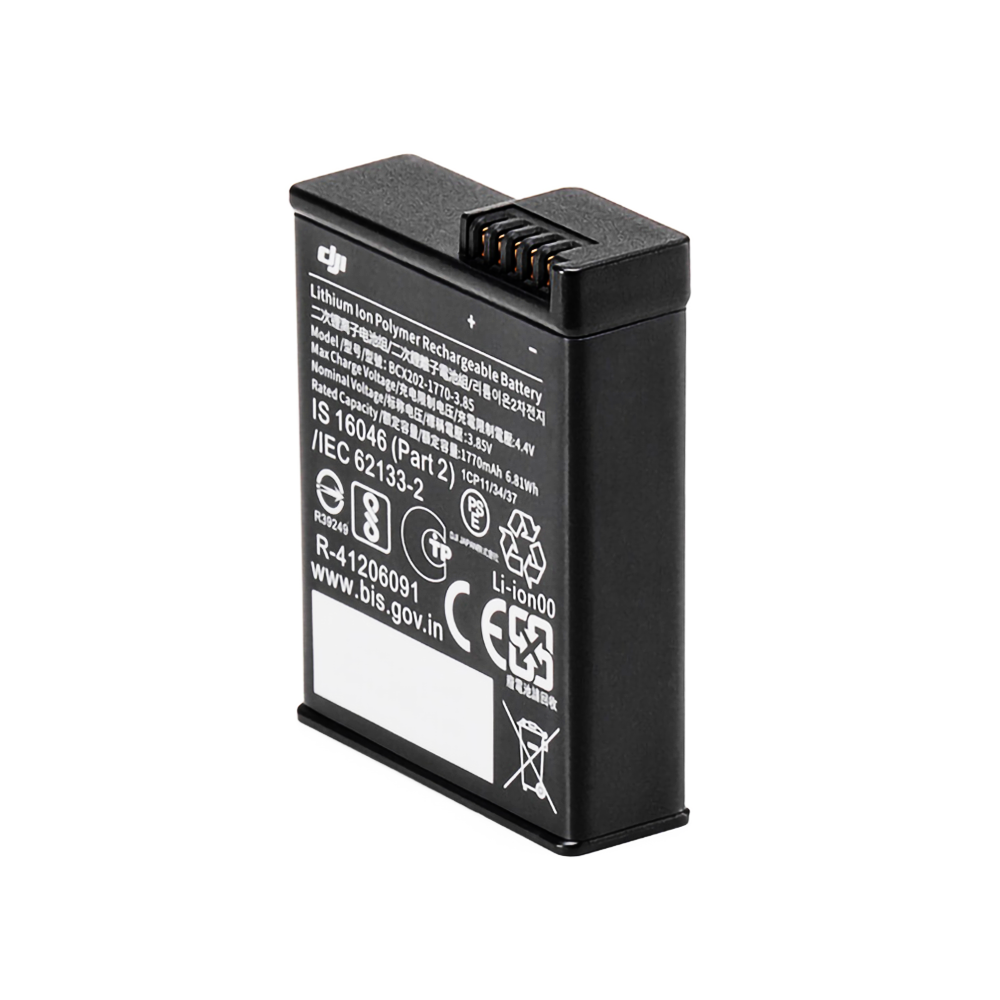 DJI OSMO ACTION 3 EXTREME BATTERY Supports up to 160 minutes* of battery life. Supports continuous recording for up to 150 minutes** in temperatures as low as -20° C (-4° F). Supports PD fast charging to power up to 80% in just 18 minutes.*** * Tested in a 25° C (77° F) laboratory environment while recording 1080p/30fps video with EIS disabled and the screens off, and should be used for reference only. ** Tested in a -20° C (-4° F) laboratory environment while recording 1080p/30fps video with EIS disabled and the screens off, and should be used for reference only. *** Tested in a 25° C (77° F) laboratory environment while using the DJI 30W USB-C Charger with the photo taking/video recording function disabled and the screens off. Should be used for reference only. Specifications Capacity: 1770 mAh Operating Temperature: -20° to 45° C (-4° to 113° F) Dimensions: 44.2×34.4×12.1 mm (L×W×H) Compatibility:...