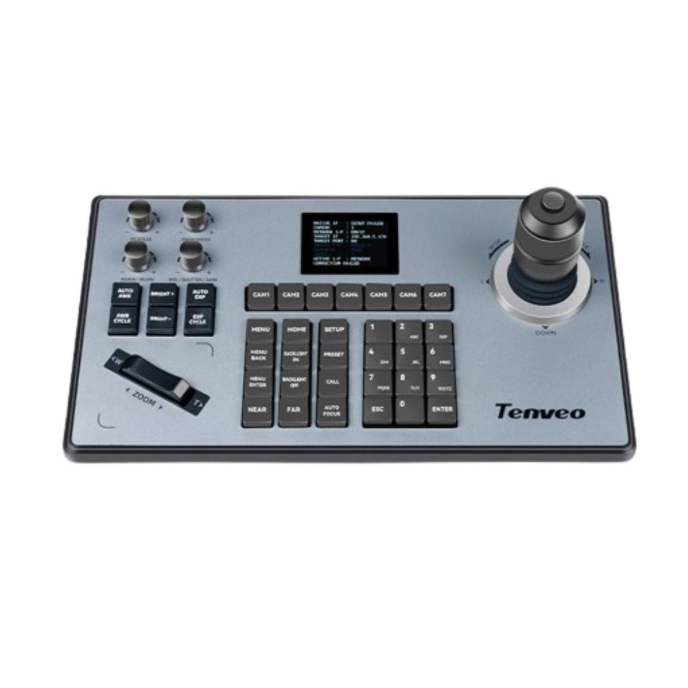 Tenveo TEVO-KB200 PTZ Camera Keyboard Controller Techinical Specifications: Model: TEVO-KB200 Chip: His3536DV100 System: Linux Protocol: FulI VISCA, ONVIF,NDI,PELCO-P,PELCO-D Output: RS422/RS485,RS232,RJ45 Accessories: Seesaw switch, knob, mechanical button, 4D joystick Screen: TFT LCD 320*240...