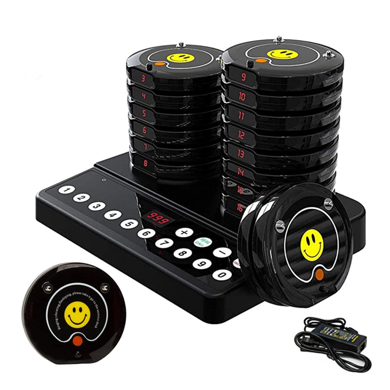 Restaurant Guest Pager System ( COASTER BUZZER ) OUTSTANDING PERFORMANCE- The restaurant pagers system consists of one 98 channel wireless keypad transmitter and 16pcs pagers. It makes it possible to avoid staff chaos, keep social distance, and improve work efficiency. 2 CALLING MODES- 2 modes for restaurant paging system are vibration + flash + buzz and vibration + flash, meeting different occasions' needs. Widely used in restaurants, hotels, hospitals, churches and cafés. DIGITAL CONTROL & DISPLAY- Equiped with a large LCD screen display for easy operation and precise control. With a number display area in front, you can place your store image, name, or other advertisements. The waiter presses the number easily to call the customer to take away their food. WIRELESS REMOTE CONTROL- The built-in antenna creates a high sensitivity to enable the transmitter to call pagers correctly. The pager working range is 200-300 meters. LONG BATTERY LIFE- Each wireless paging system has a built-in 3.7V 200mAh rechargeable battery with a low battery indicator. The continuous working time is about 24 hours after a full charge.