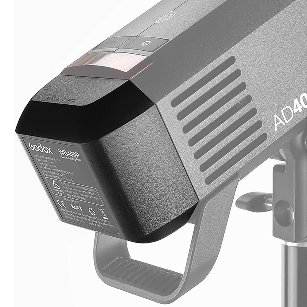 Godox WB400P 2600mAh Battery for AD400Pro Flash Head The interchangeable Li-Ion Battery for AD400Pro Flash Head from Godox produces up to 380 full power flashes and charges fully in two hours. Battery Capacity: 2600 mAh Chemistry: Lithium-Ion Flashes Per Charge: 380 Flashes (Full Power) Charges in 2 Hours