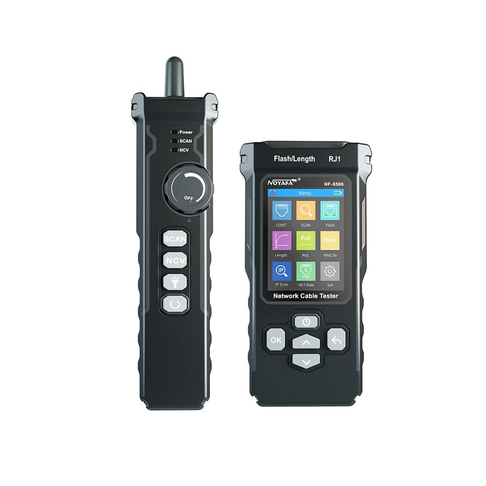 NF-8506 TDR network tester has IP scanning, POE test, anti-interference RJ11 RJ45 CAT5 CAT6 cable test, continuity test, Ping network speed test, port flashing, sensitivity adjustment, cable Function of length test and LED flashlight. PING Tester+IP Scanner- This handheld Ping cable toner can be used to diagnose and maintain local area networks (Lans) running TCP/IP protocols. Powerful PING capabilities can verify connections, check the integrity of transmitted and received data, indicate network traffic load by measuring round-trip times, and provide MAC addresses for IP addresses Time Domain Reflectometry (TDR) - The NF-8506 Cable Tester is a portable Time Domain Reflectometry (TDR) cable length tester. It measures cable length, calibrates Velocity of Propagation (VoP) values, finds the distance to faults in cables, convenient real-time on-site measurement Network speed test + Cable Continuity test- Ethernet tester can quickly assess network speed issues. Conducts PING tests from multiple locations to gauge server and website response speeds. Allows users to ensure the integrity and connectivity of network cables by identifying any breaks, openings, or short circuits along the cable length. POE Tester- Identifies PoE devices efficiently. Detects crossover methods (unknown/end-span/mid-span/8-core power supply) and polarity. Comprehensive PoE detection, including non-standard, IEEE 802.3AF, and IEEE 802.3AT. Port Flashing and Identification- Facilitates quick identification of network cable ports. Indicator lights on the connected port in the device flash to help locate cables accurately. Displays port information including operating rate, duplex mode, and negotiation settings. ...