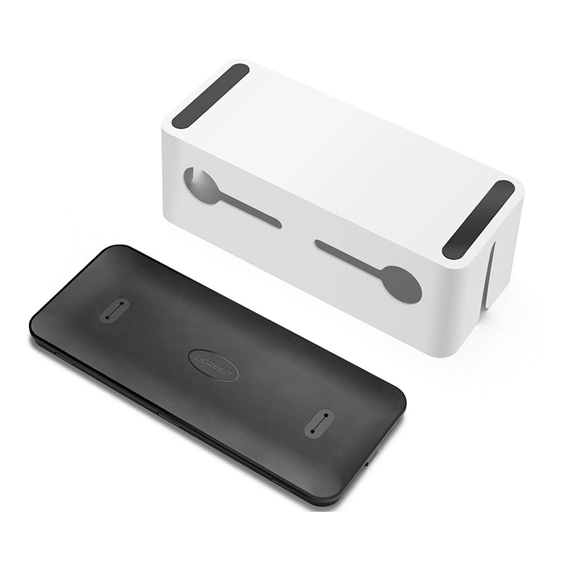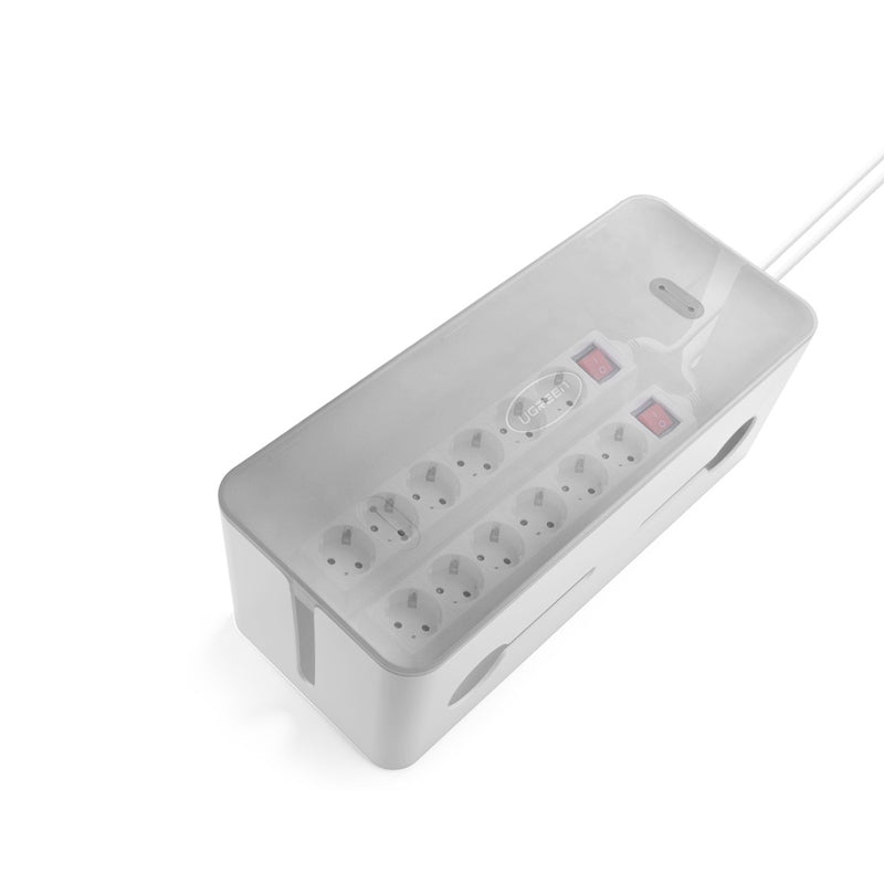 Universal Organizer Cable Management Box Universal Management Cable Box is designed to store your power strips and wires in the box; Make your table clean and also protect wires & power strip from children, pets, water, dust and other accident. Made of Heat Resistant ABS material for your safty purpose. Cable outlets on the side of the box are great for placing the cords, adapters in good order and provide ventilation.