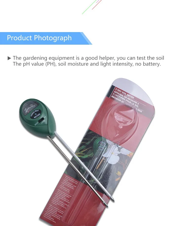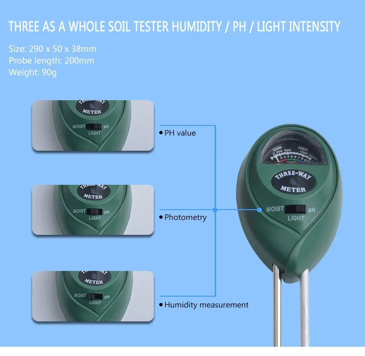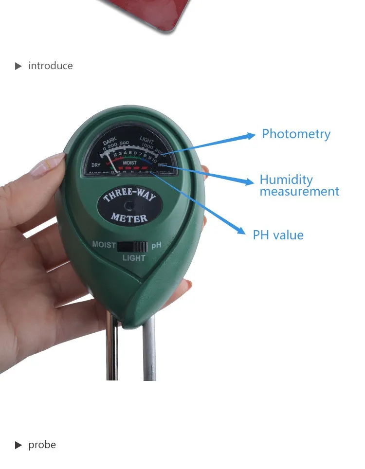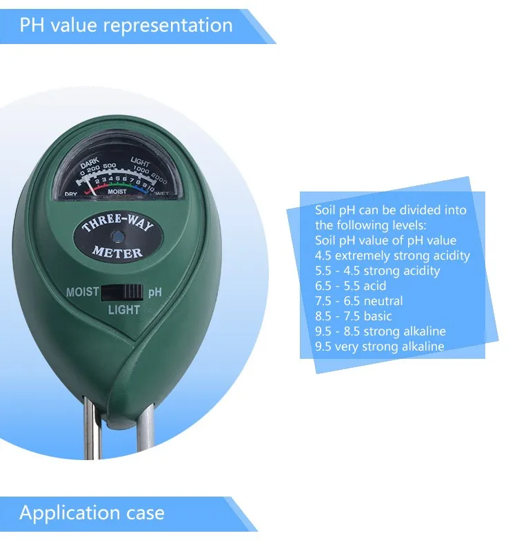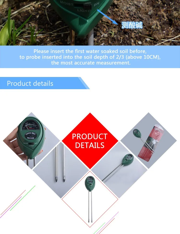 - to test the soil conditions ( Moisture/Light/PH) of fruits, flowers, vegetables, shrubs, etc. with high accuracy and easy operation