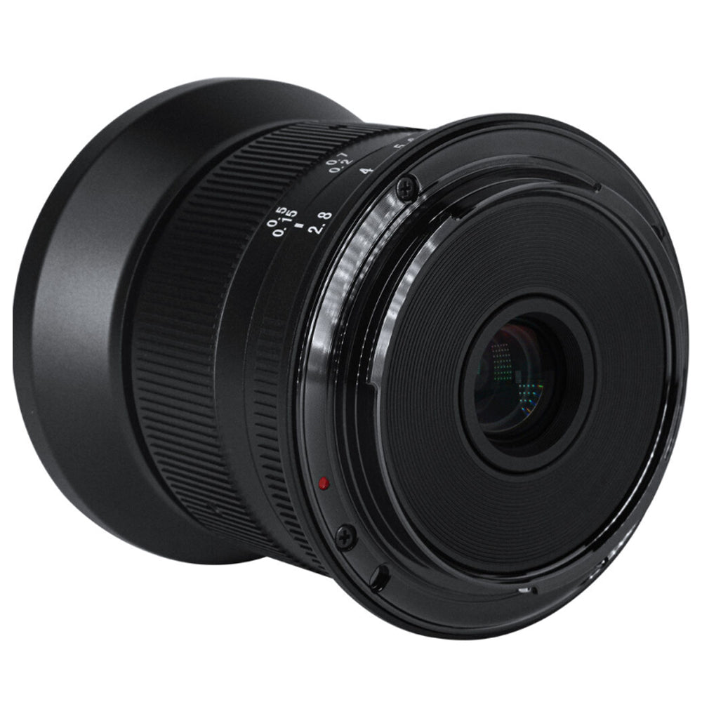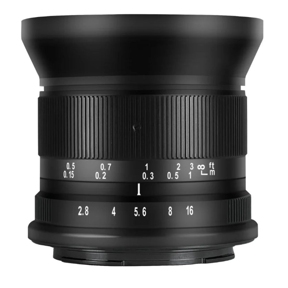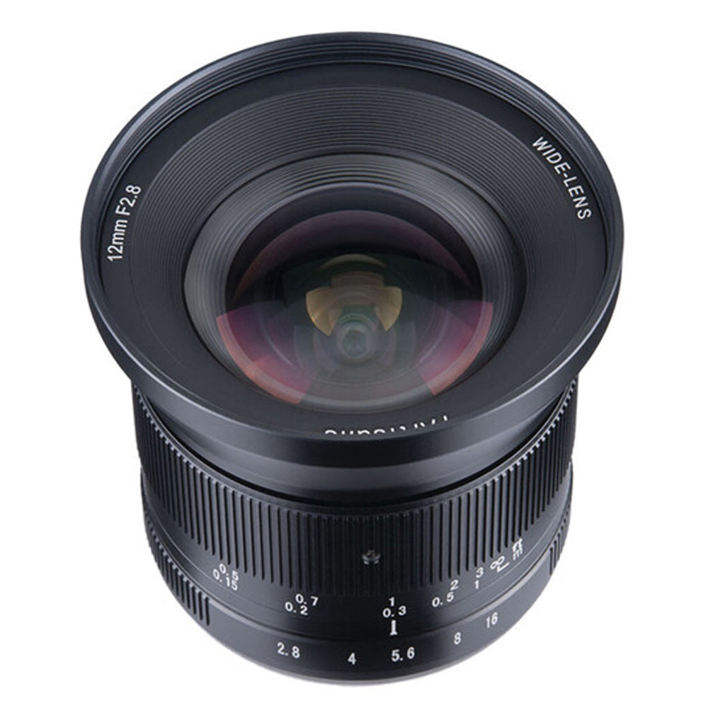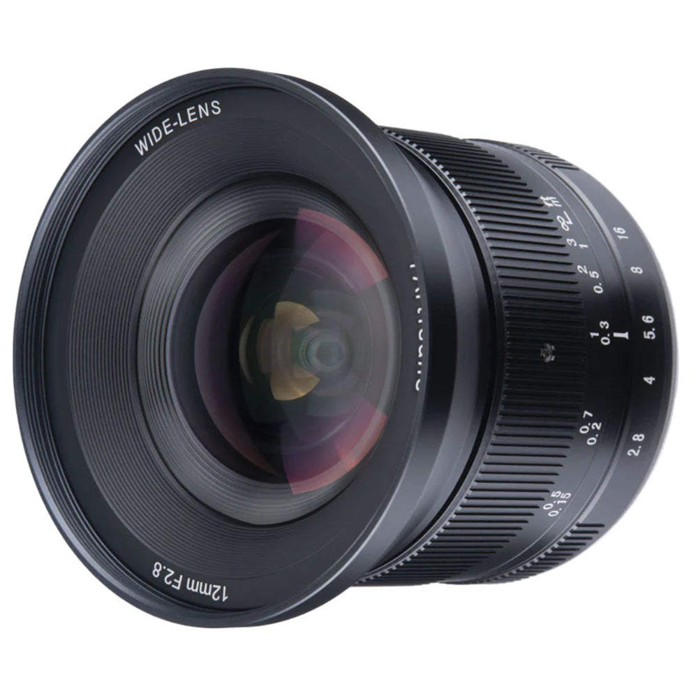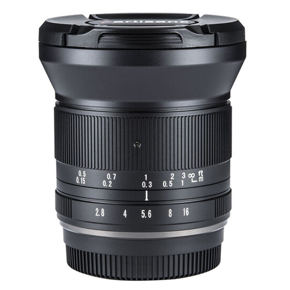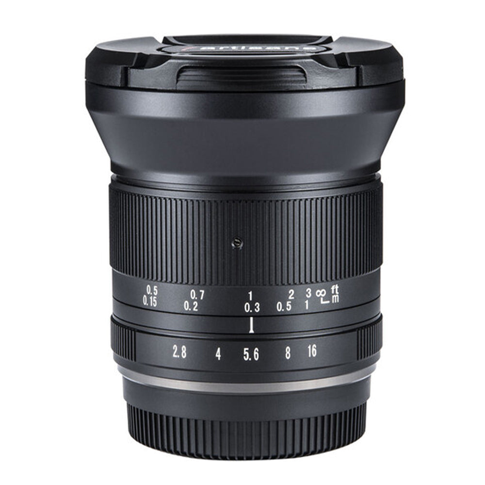 12mm f/2.8 Mark II Lens from 7artisans Photoelectric is an all-manual lens well-suited for landscape, cityscape, and architectural subjects requiring a broad field of view. The lens's f/2.8 maximum aperture benefits working in a variety of lighting conditions and helps to maintain the small and lightweight form factor for handheld shooting. Its manual focus design is complemented by both depth of field and distance scales for utilizing pre-focusing and zone focusing techniques. Additionally, the lens permits working with subjects as close as 7.9" away.