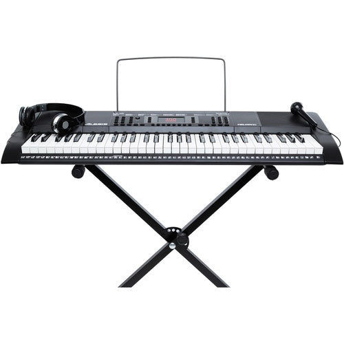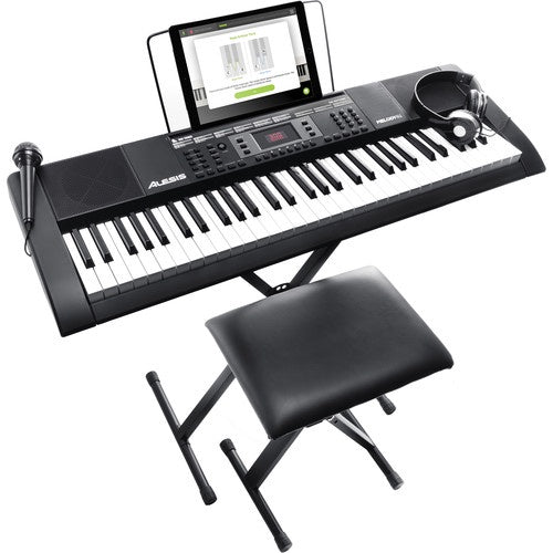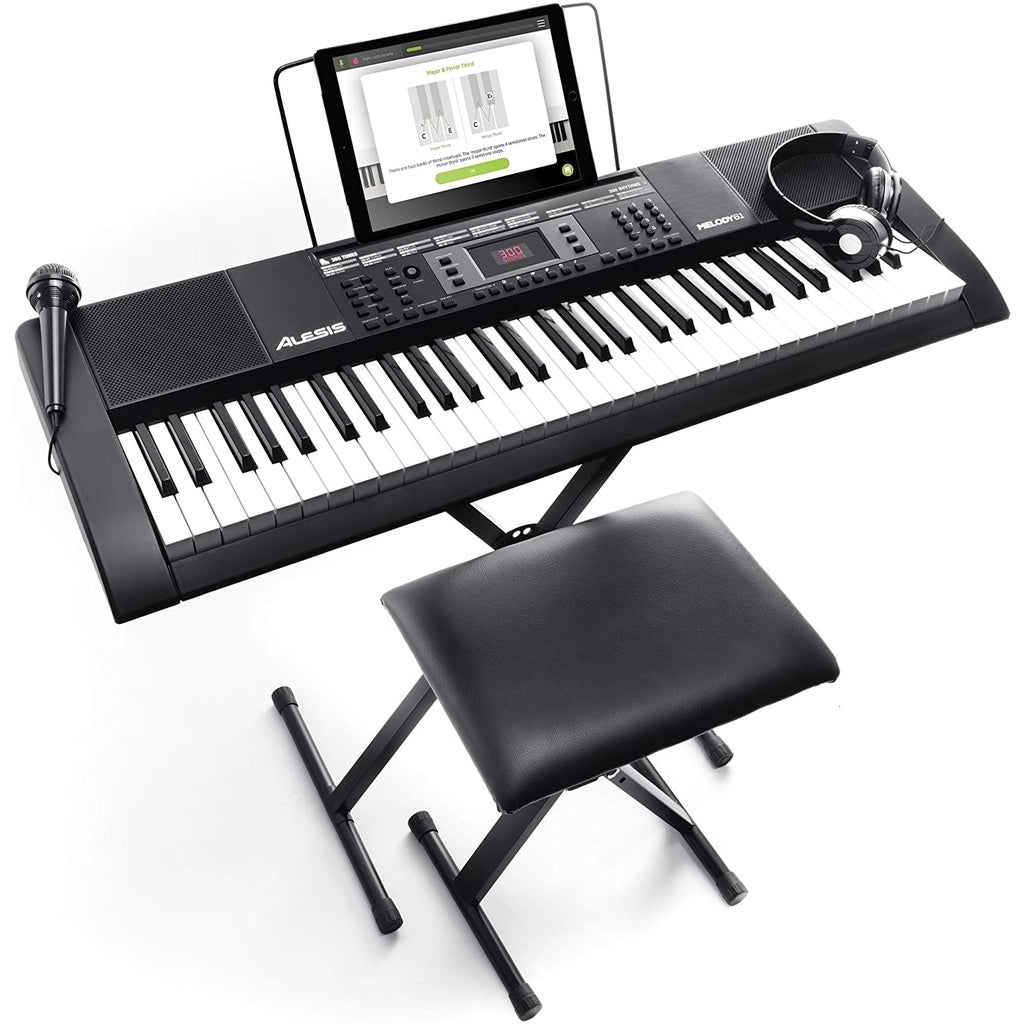The MELODY 61 keyboard provides everything you need to get started and learn to play today. It includes: an easy-to-assemble stand, a bench with three adjustable height settings, headphones that automatically mute the speakers for private practice, a power adapter, and a microphone for singing along while you play.