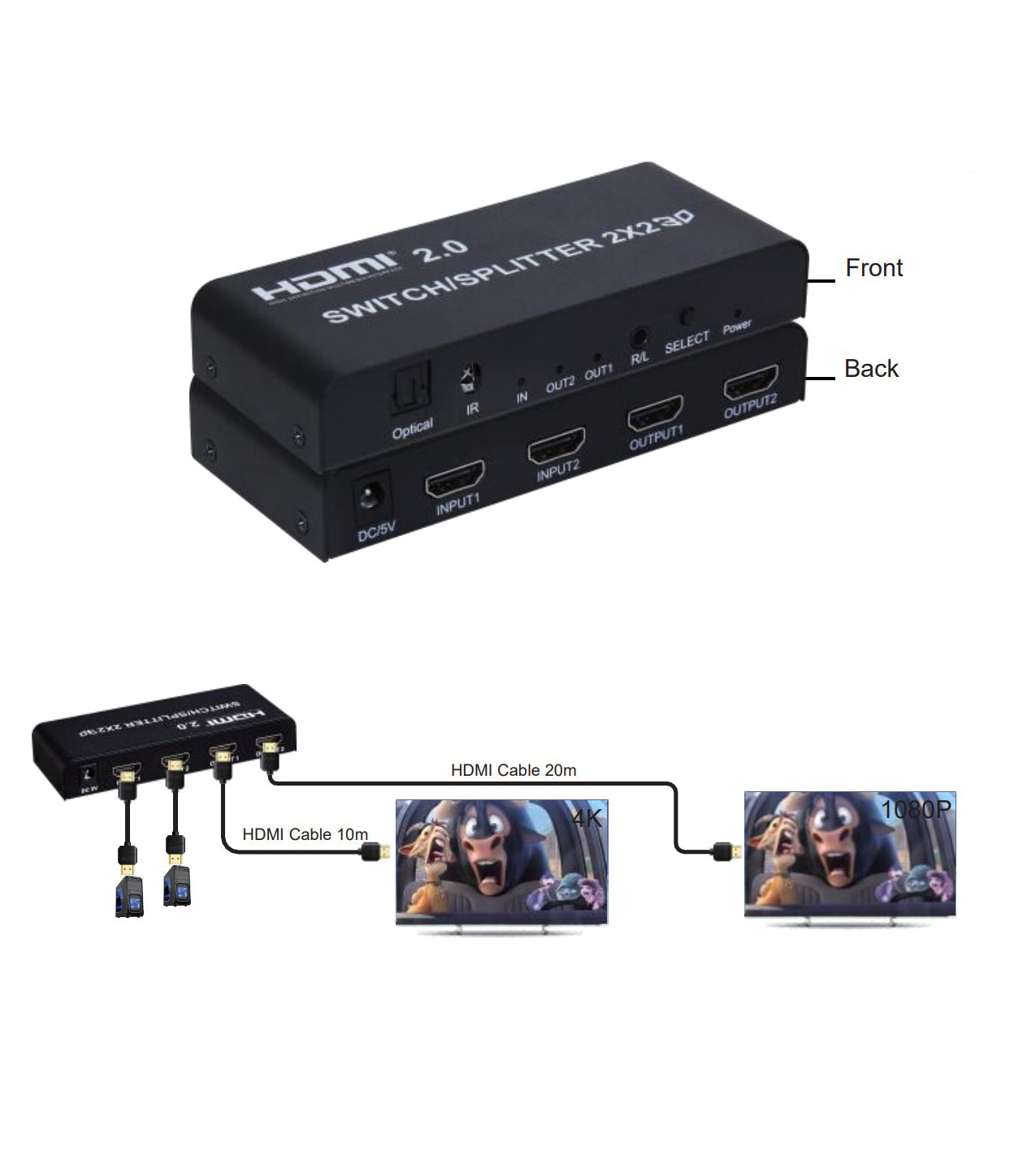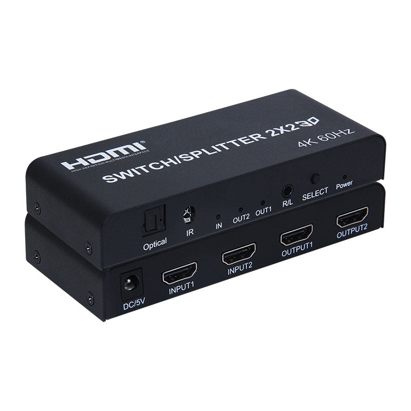 - This 2x2 HDMI 2.0 Switcher/Splitter can connect two HD signal sources with two HD display terminals, it allows two HDMI signals to be split or switched to two HDMI compatible monitors or projectors. And it can amplify your HDMI signals at the same time. This two signal sources can be switched freely via button or remote control. The HDMI Switcher/Splitter 2x2 can support full HD video format, highest resolution 3840x2160/60Hz.