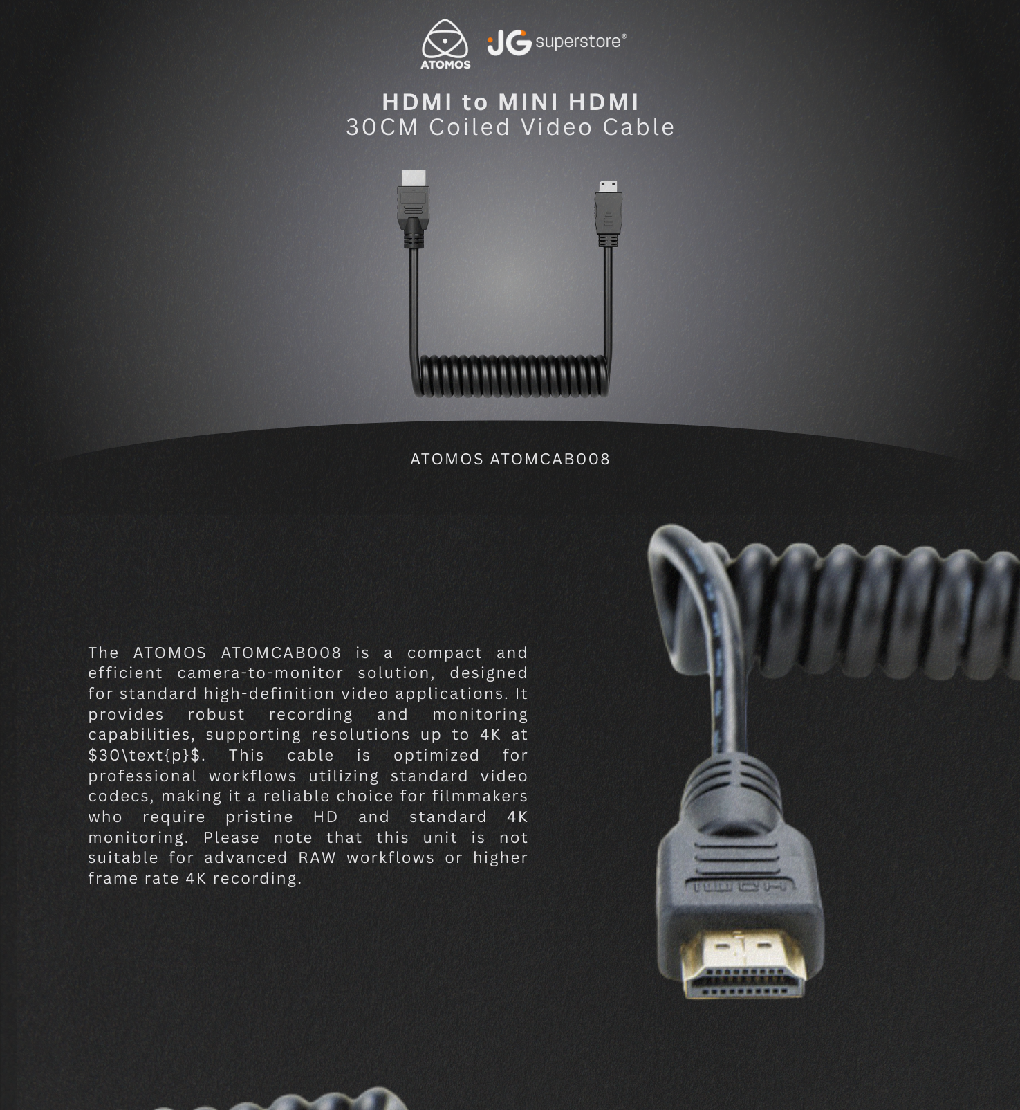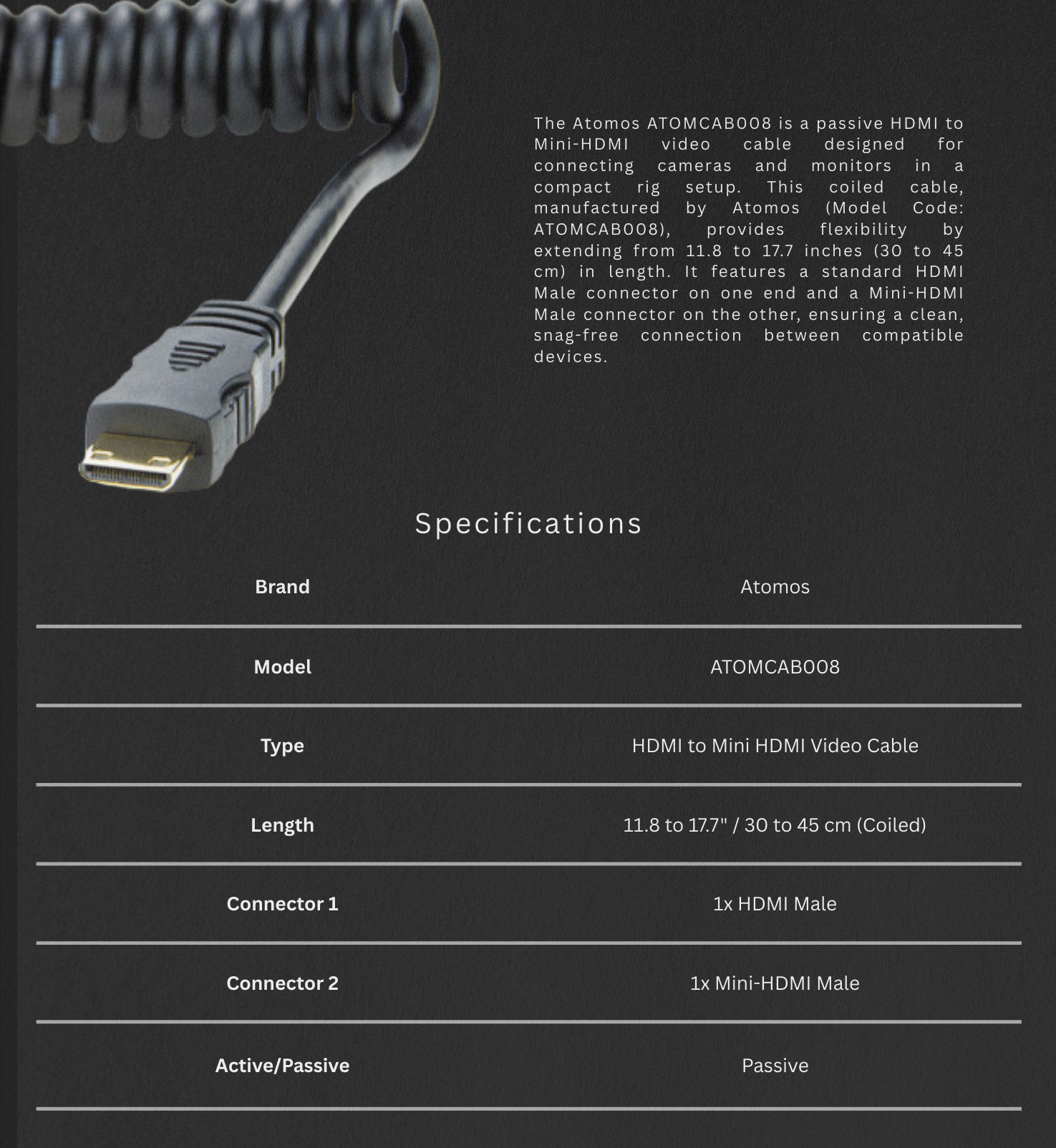 The 11.8 to 17.7" Mini-HDMI to HDMI Coiled Cable from Atomos is coiled to prevent clutter, but it can extend up to 17.7".
