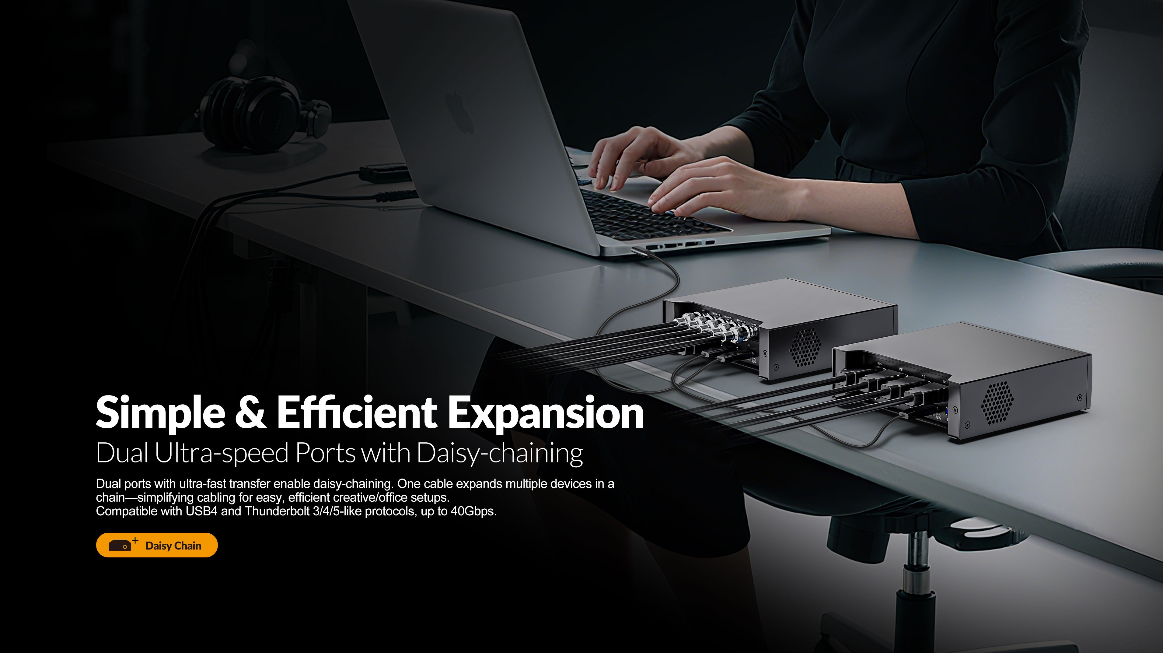 → 2 × Ultra-Speed Thunderbolt ports (up to 40 Gb/s, supports data, video, power supply, and daisy-chaining)