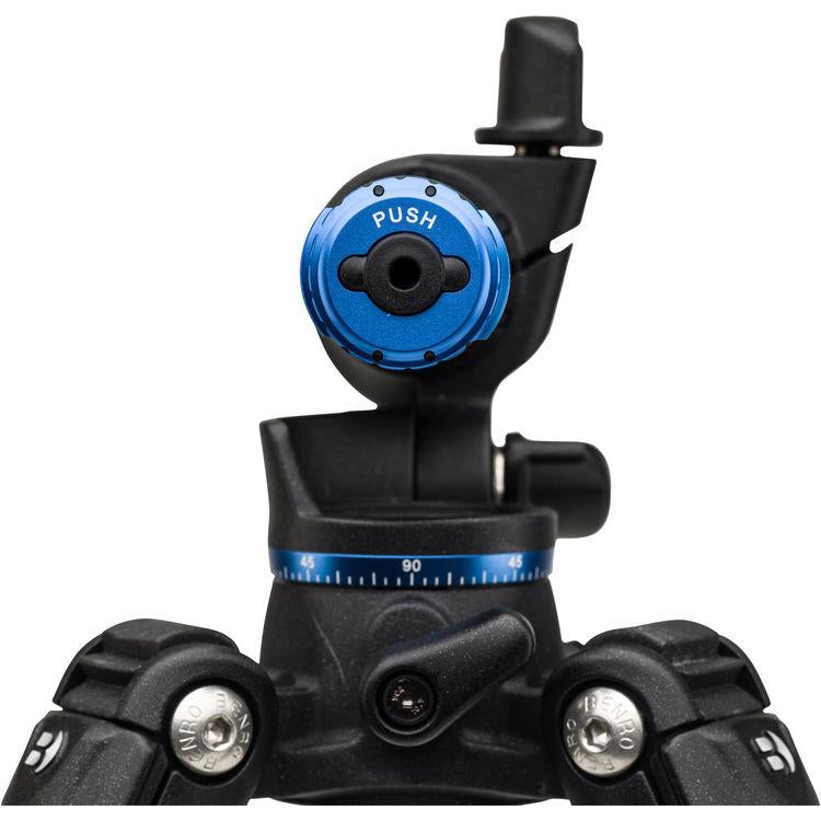 Each one of the tripod's legs features a 4-section design allowing for the optional deployment of different leg sections to achieve varying heights. The legs also utilize Benro's sealed twist-locks which help to resist dust and moisture. One of the legs, marked with a blue ring, can also be joined with the center column to form a monopod - a useful feature for shooting in environments where tripods may not be permitted. The center column also features a unique lateral arm function which allows the column to tilt horizontally and lock in a wide range of different angles and positions.