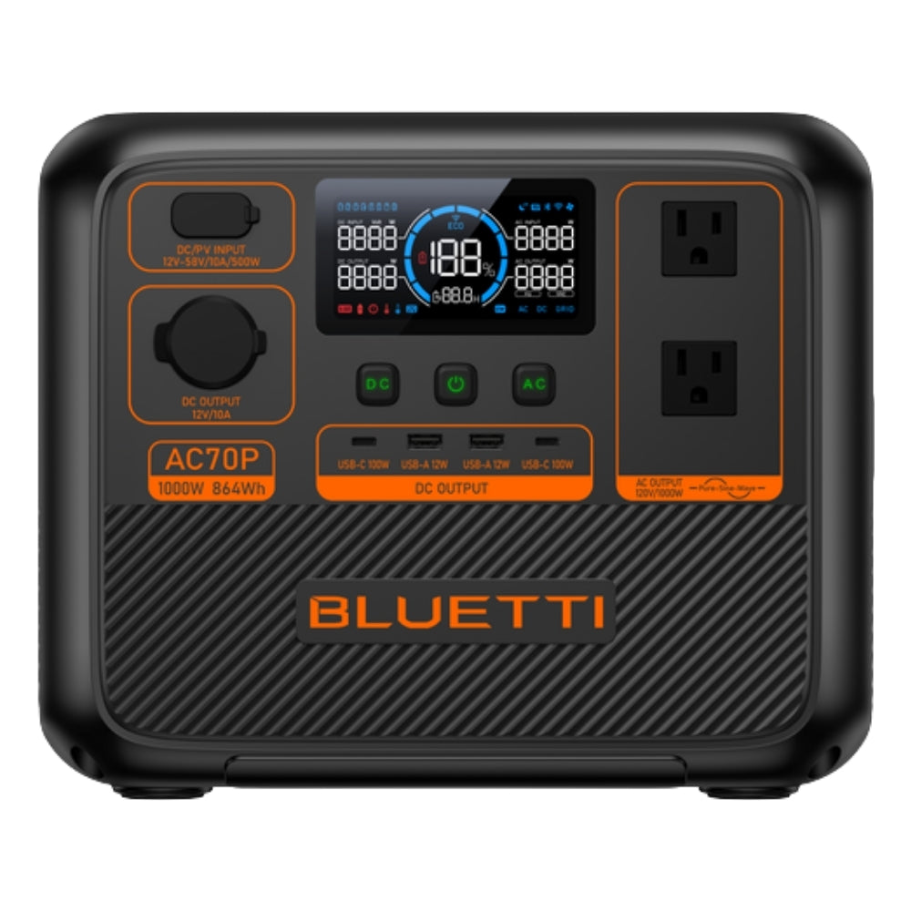 The Bluetti AC70P is a high-performance 1000W portable power station with an 864Wh LiFePO₄ battery, designed to keep your essential devices running whether you’re off-grid, camping, on the road, or facing a power outage at home. It delivers clean pure sine wave power for sensitive electronics, plus boosted Power Lifting mode up to 2000 W to handle heavier loads like grills, hair dryers, and kettles. Compact yet rugged, this versatile unit offers multiple output ports and fast charging, making it an all-around power solution for outdoor adventures and emergency backup.