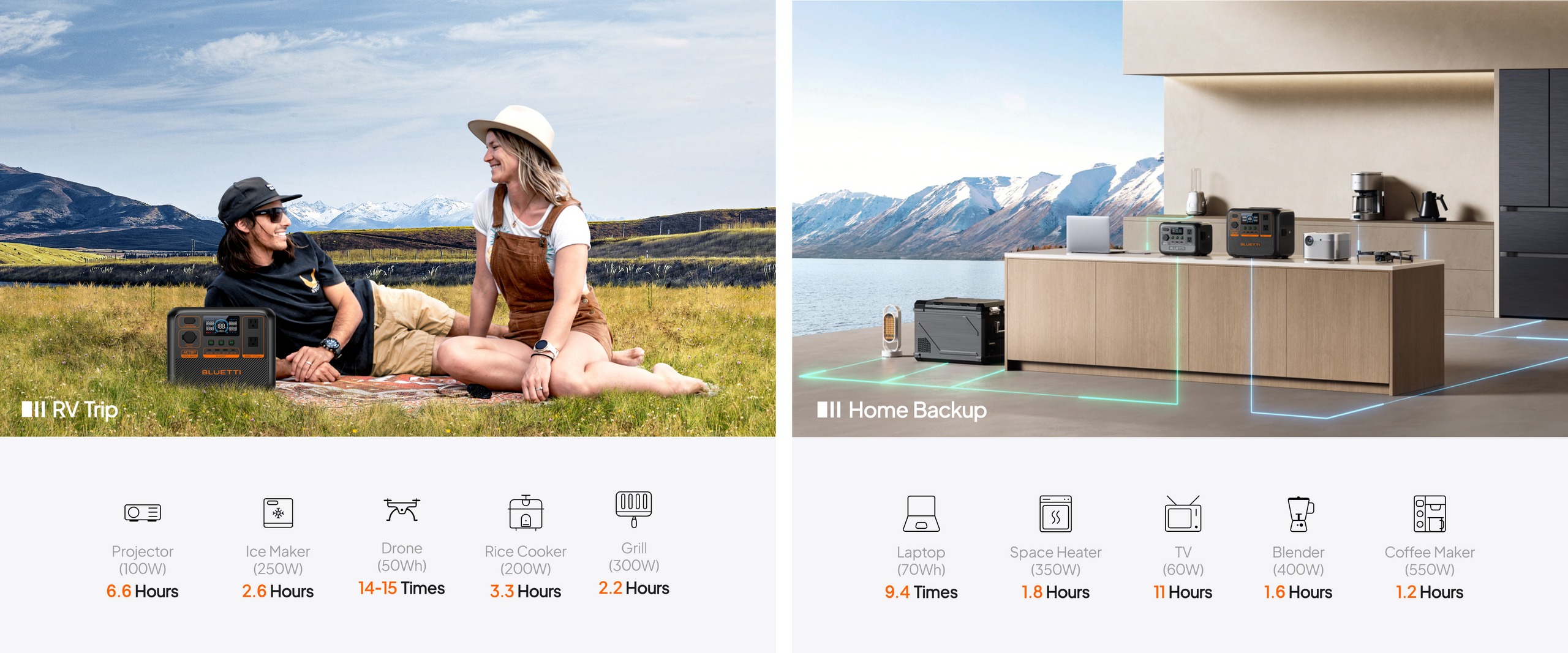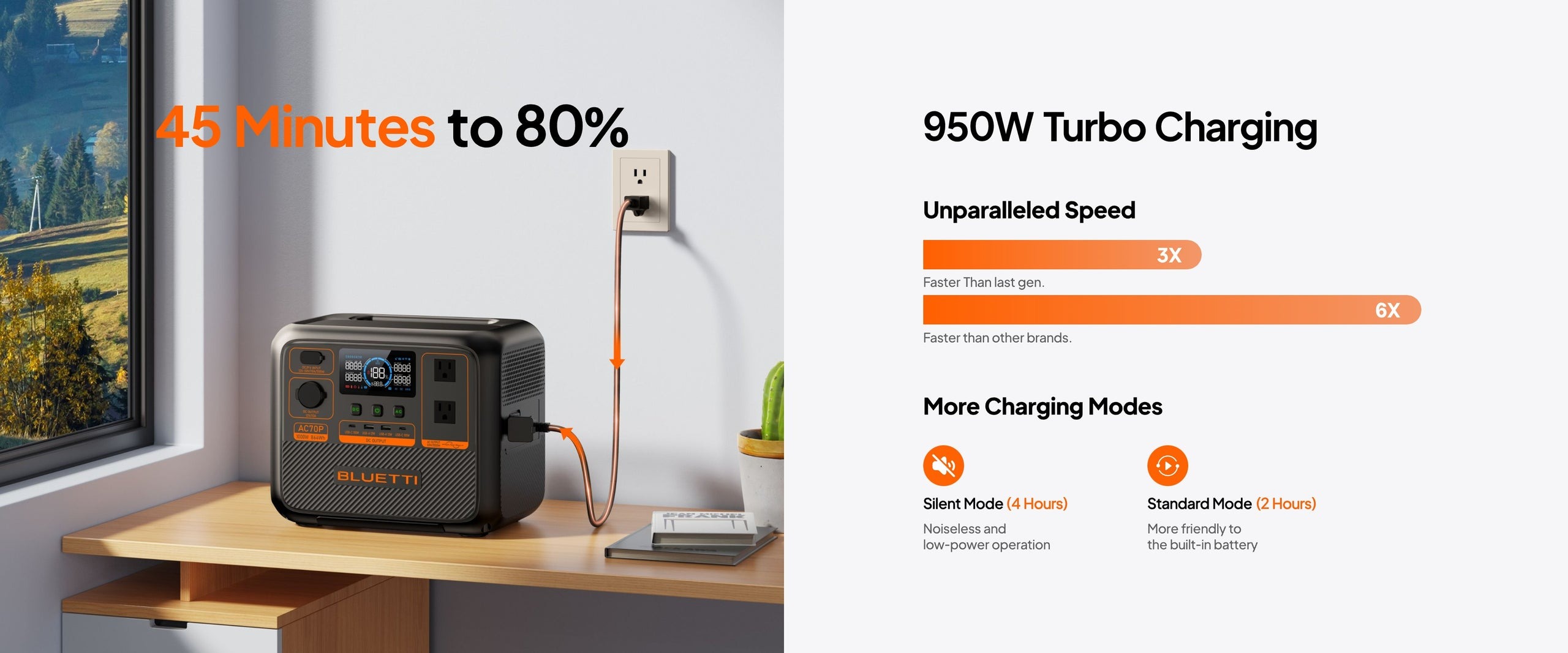 With BLUETTI Turbo Charging Technology, you no longer have to wait a long time to get it charged. The fast charging allows you to replenish it at your last-minute pack-up, ensuring your power is at the ready before you hit the road.