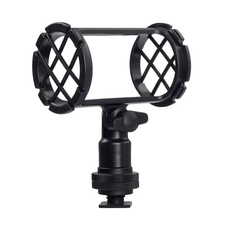 The BOYA microphone shock mount features a four-point suspension to accommodate shotgun microphones measuring ¾ to 1" (19-25mm) in diameter. The shockmount is easily angled with its rubberized adjustment knob. There is a built-in shoe for camera mounting, and a 3/8"-16 thread connection at the base mounts the shockmount to boompoles and universal hand-grips.