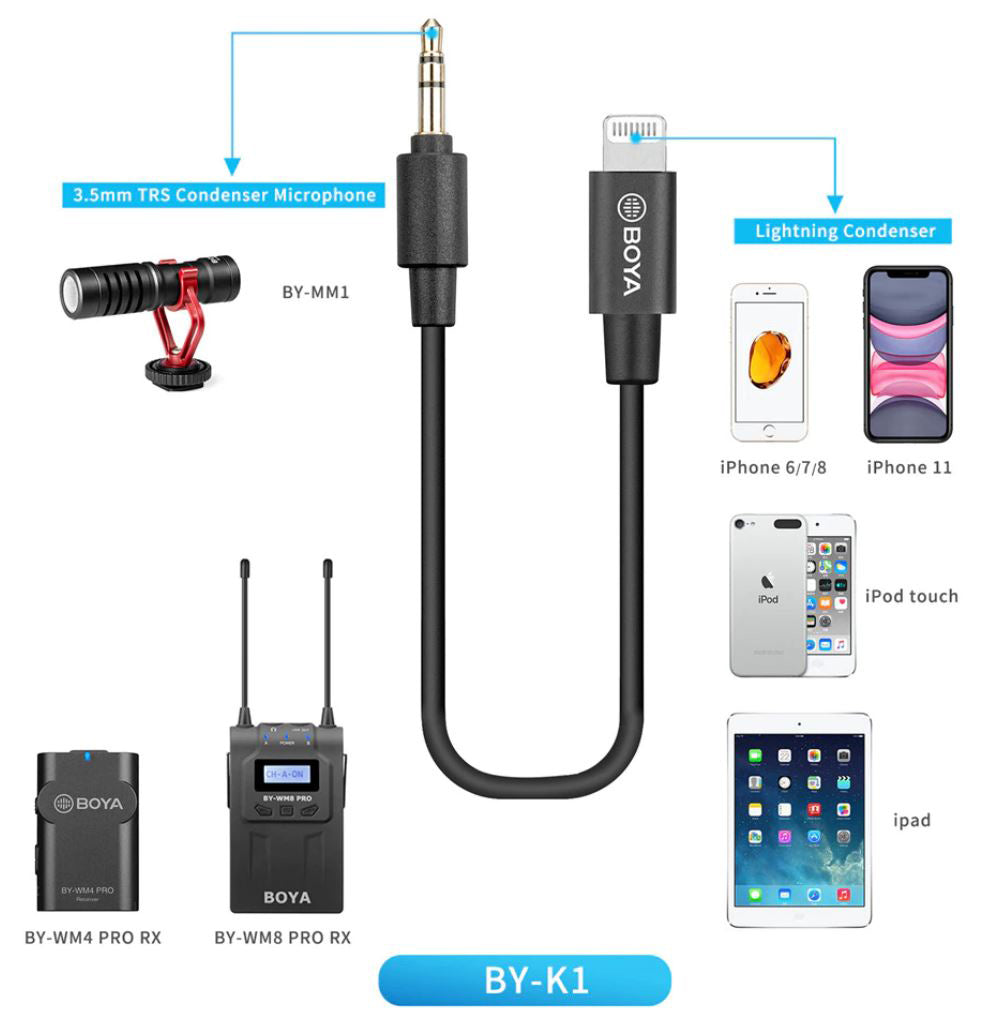 • The 20cm BOYA BY-K1 is a short adapter cable that converts an analog 3.5mm signal source to a digital Lightning output, making it ideal for connecting a shotgun microphone outfitted with a 3.5mm TRS female output port directly into a Lightning-equipped iOS mobile device such as an iPhone or iPad. The BY-K1 features a 3.5mm TRS male mini plug on one end and a Lightning male connector on the other.