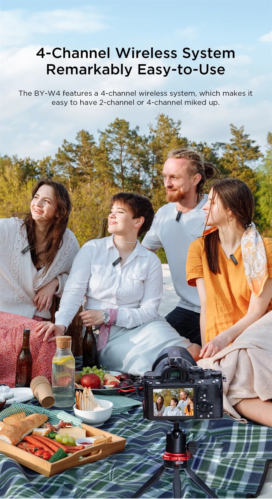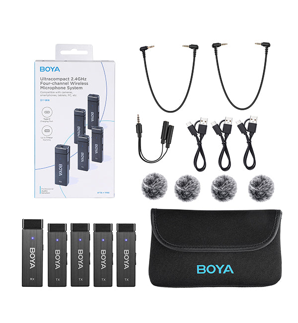 The BY-W4 is a wireless microphone system that offers broadcast quality and reliable performance, delivering clear and crisp audio. It features a wireless system that allows for up to four transmitters to be used simultaneously, making it perfect for multi-person interviews, live performances, live streaming, conferences, panel discussions, and other events.