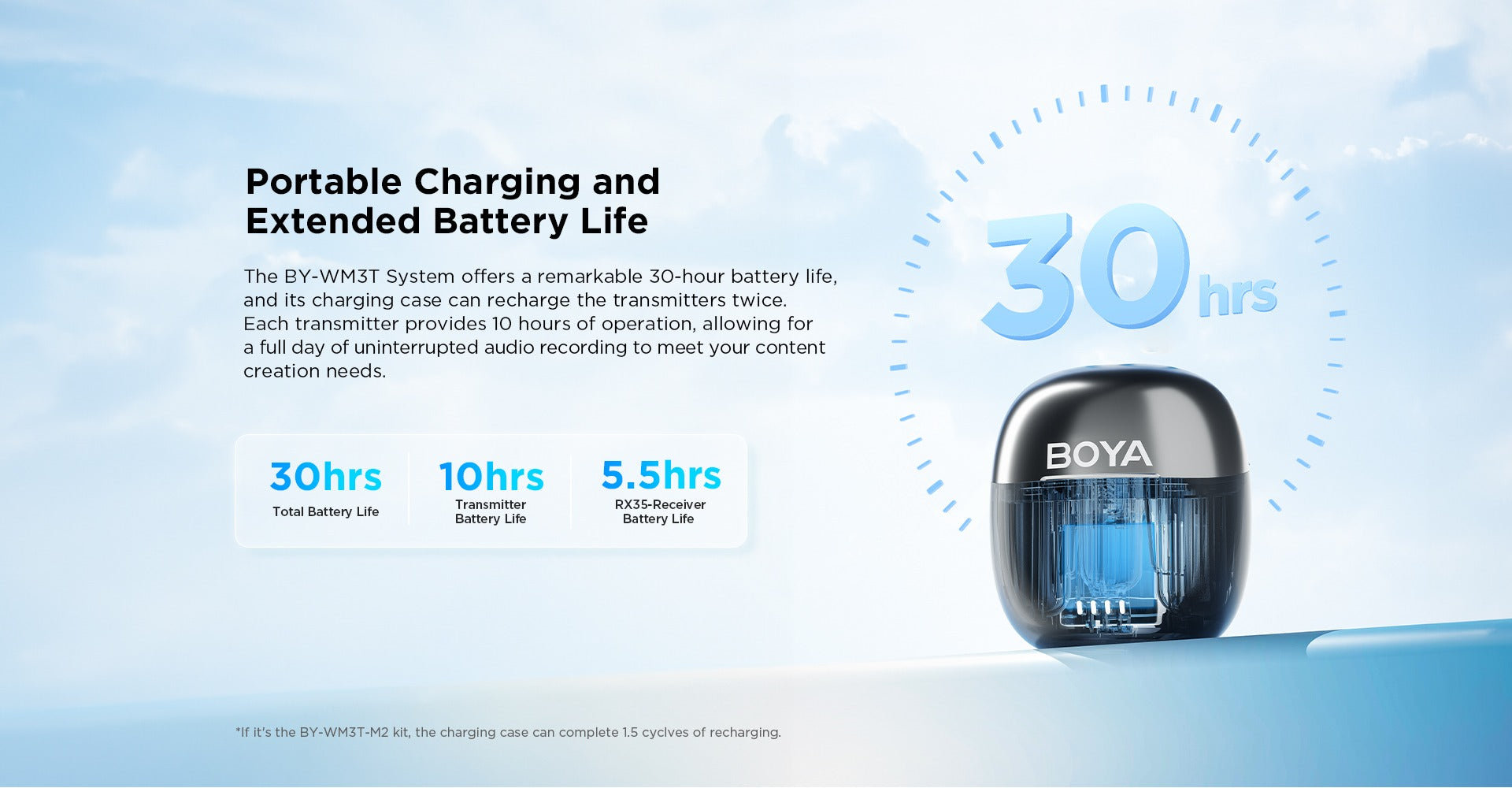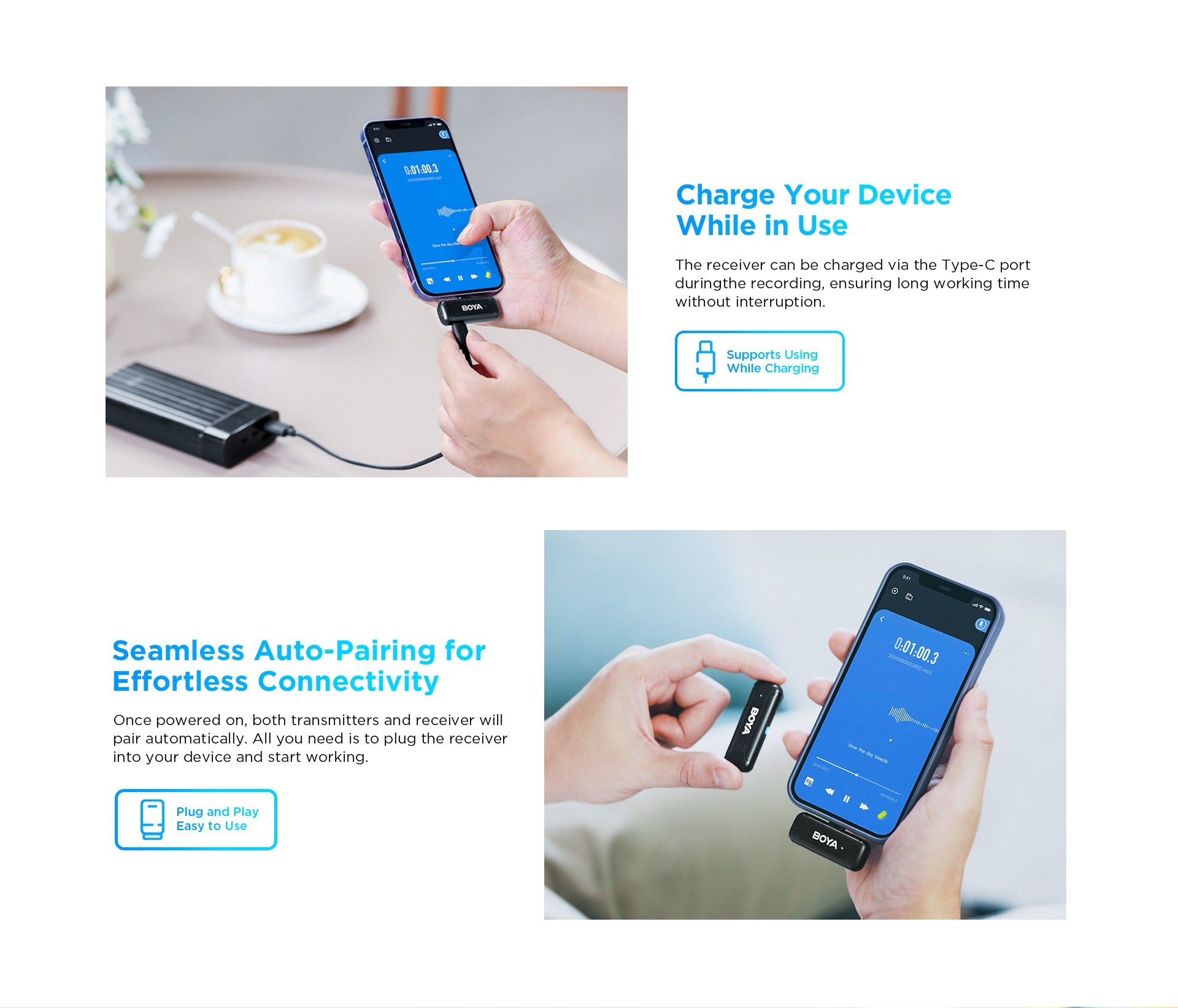 The BY-WM3T-U2 is an ultra-compact 2.4GHz wireless microphone system, ideal for content creation, livestreaming, vlogging, and various other applications. It features two transmitters and one USB-C receiver, ensuring compatibility with Android phones, tablets, and other USB-C devices. Moreover, the USB-C receiver can power devices and charge on the fly using the included case for added convenience.