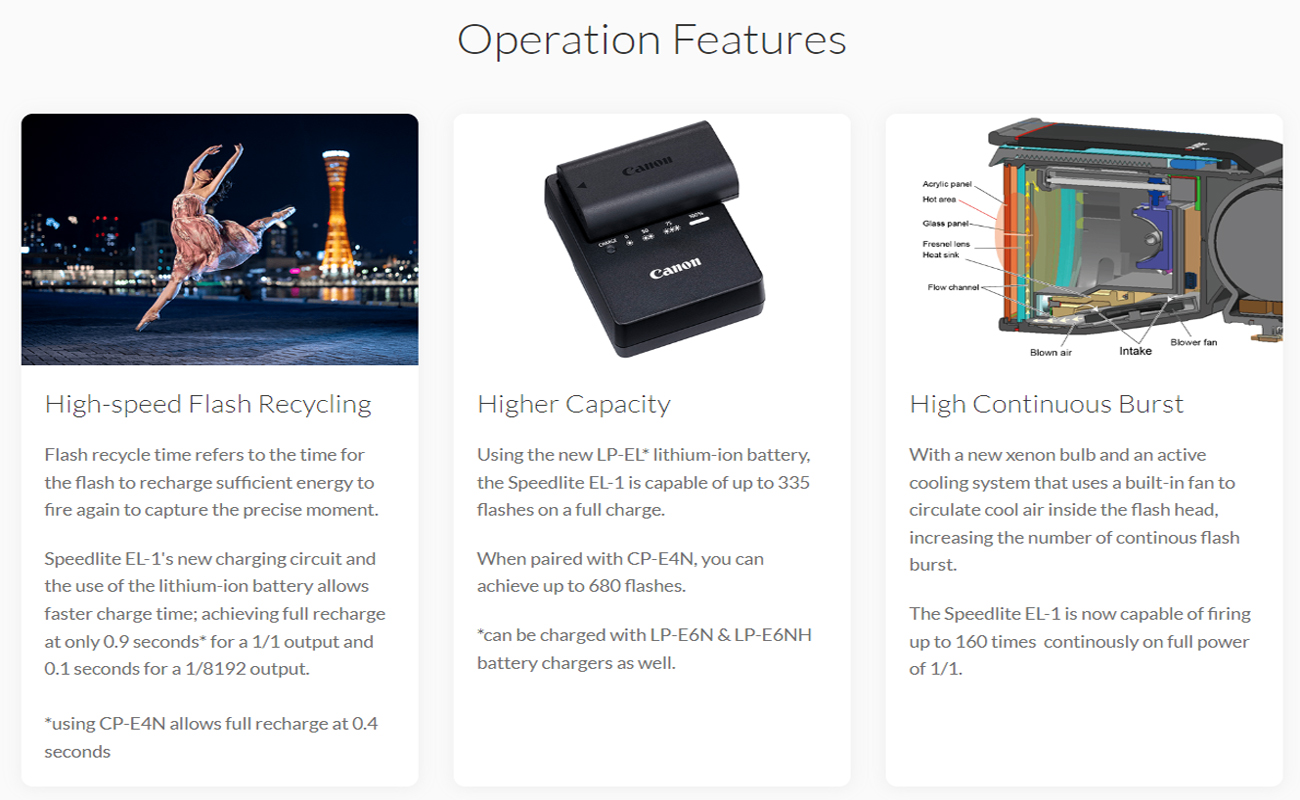 Speedlite EL-1 is capable of micro flash of power as low as 1/8192 to express colour nuances along with high-speed flash recycle time as fast as 0.1sec and up to 160 times continuous flash burst. Apart from being dust and drip resistance, Speedlite EL-1 can fire up to 335 times at full power of 1/1 with the new LP-EL battery.