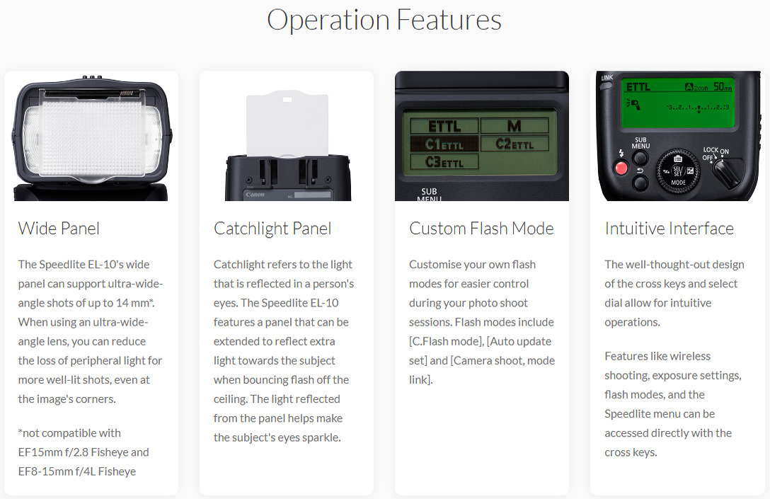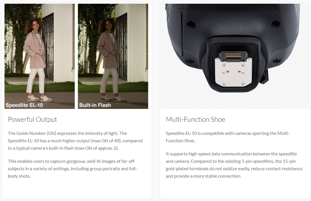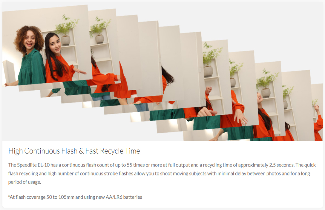 Lightweight and powerful, the Speedlite EL-10 has a maximum Guide Number of 40. Apart from fast flash recycling and being able to fire up to 55 times or more at full power, this Speedlite also sports the new Multi-Function Shoe. Armed with radio transmission feature, it is also ideal for wireless multi-flash setups.
