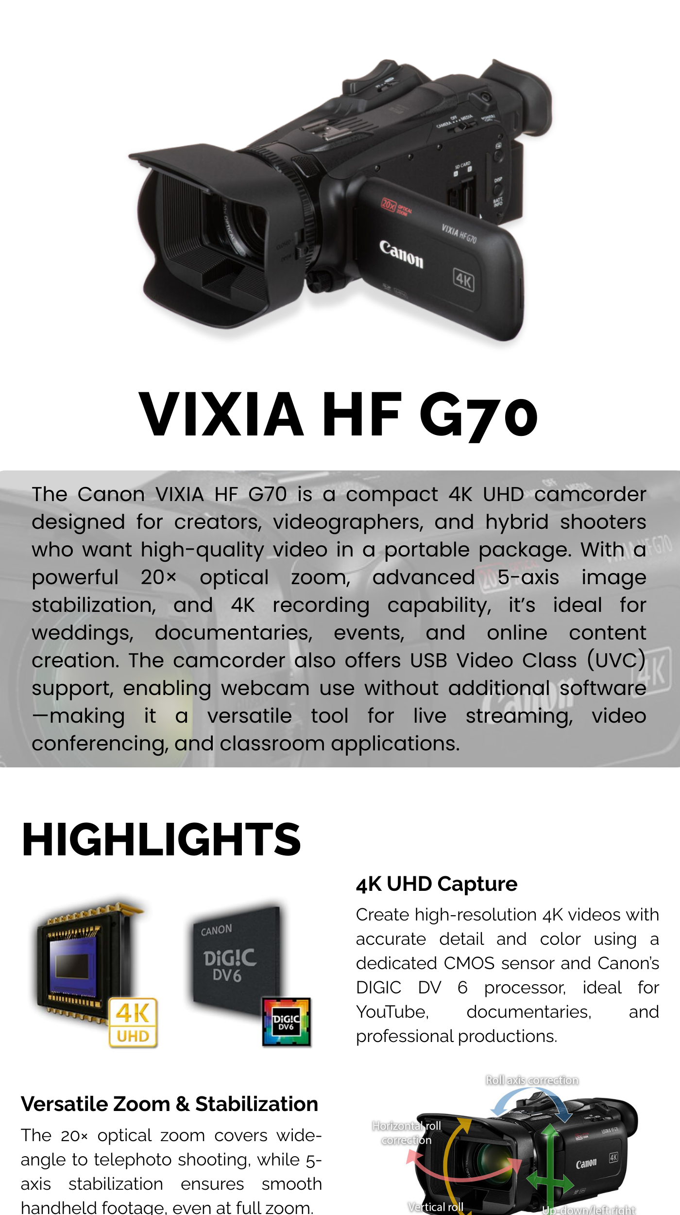 Canon Vixia HF G70 UHD 4K Professional Camcorder