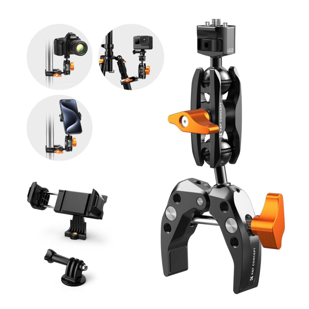 The max diameter of the super clamp jaw is 60mm, which can easily fix objects of various sizes, such as railings, tabletops, light stands, round pipes, branches, etc.