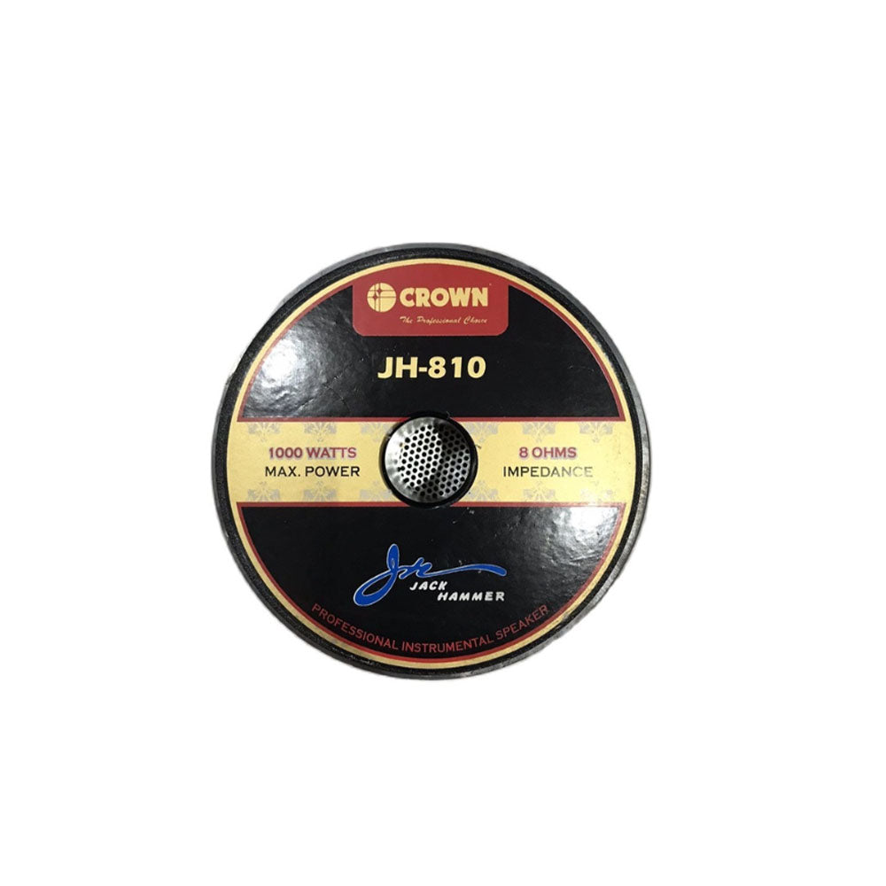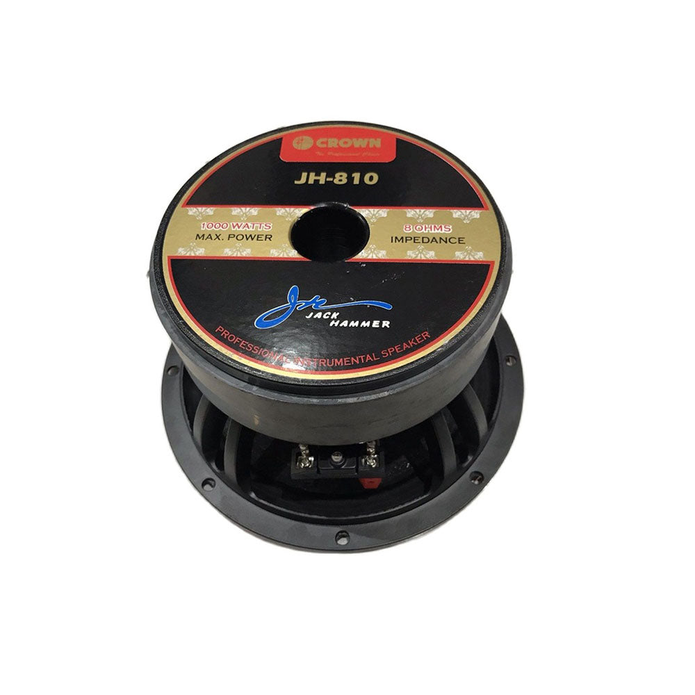 The Crown JH-810 has 1000W of Power & 8 Inches of Size. A Jack Hammer Series Professional Instrumental High Power Speaker with Double Magnet and Aluminum Die-Cast Casing. It has Max 8 Ohms Impedance, 65mm Voice Coil, 35Hz-18kHz Frequency Response & 114dB Sensitivity Level.