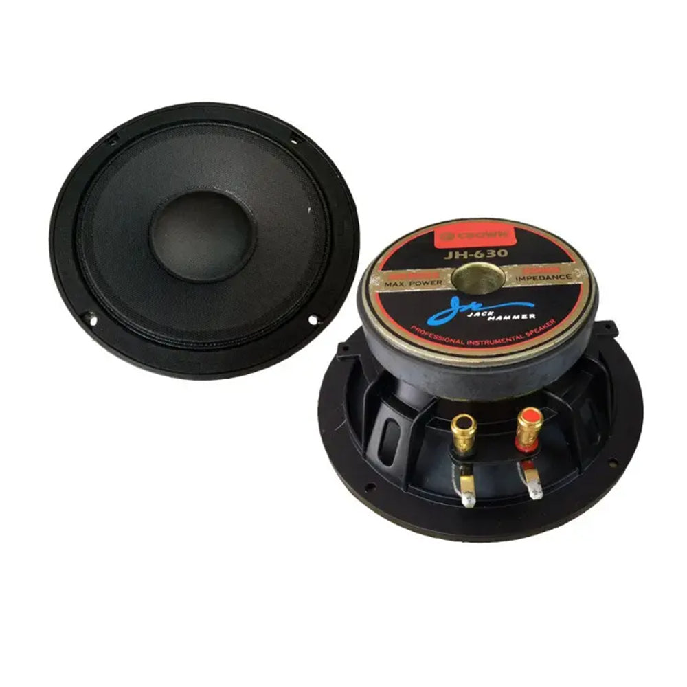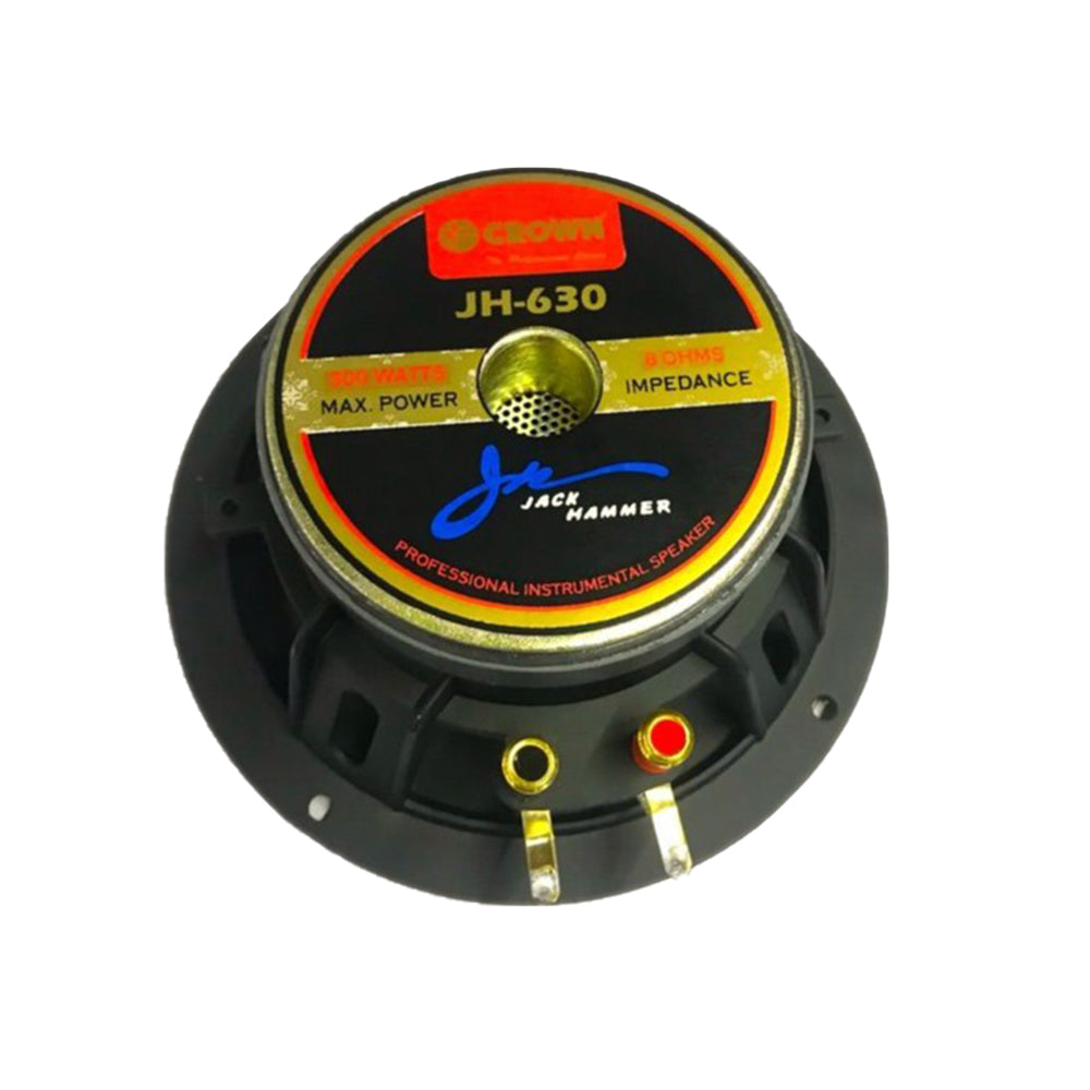 The Crown JH-630 has a 300 watts of power and 6½ Inches Size. A Jack Hammer Series Professional Instrumental High Power Speaker with Aluminum Die-Cast Casing. It has a Max 8 Ohms Impedance, 35.5 Voice Coil, 100Hz-15Khz Frequency Response and 107 dB Sensitivity Level.