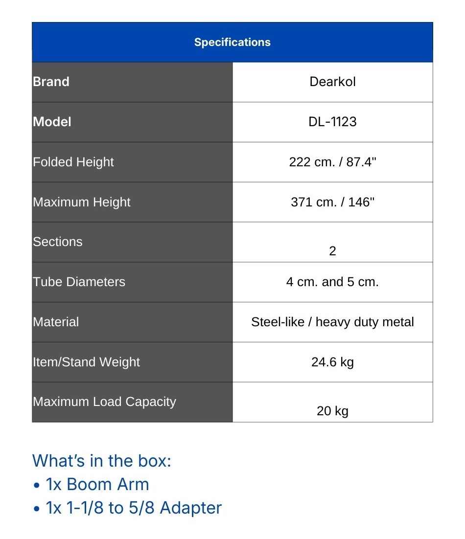 Dearkol DL-1123 is a professional-grade boom arm / boom stand used in photo and video production to support lights, microphones, or other equipment. It’s an aluminum reinforced handle tilt boom arm with stand, with a substantial load capacity and adjustable length, designed for studio or location work.