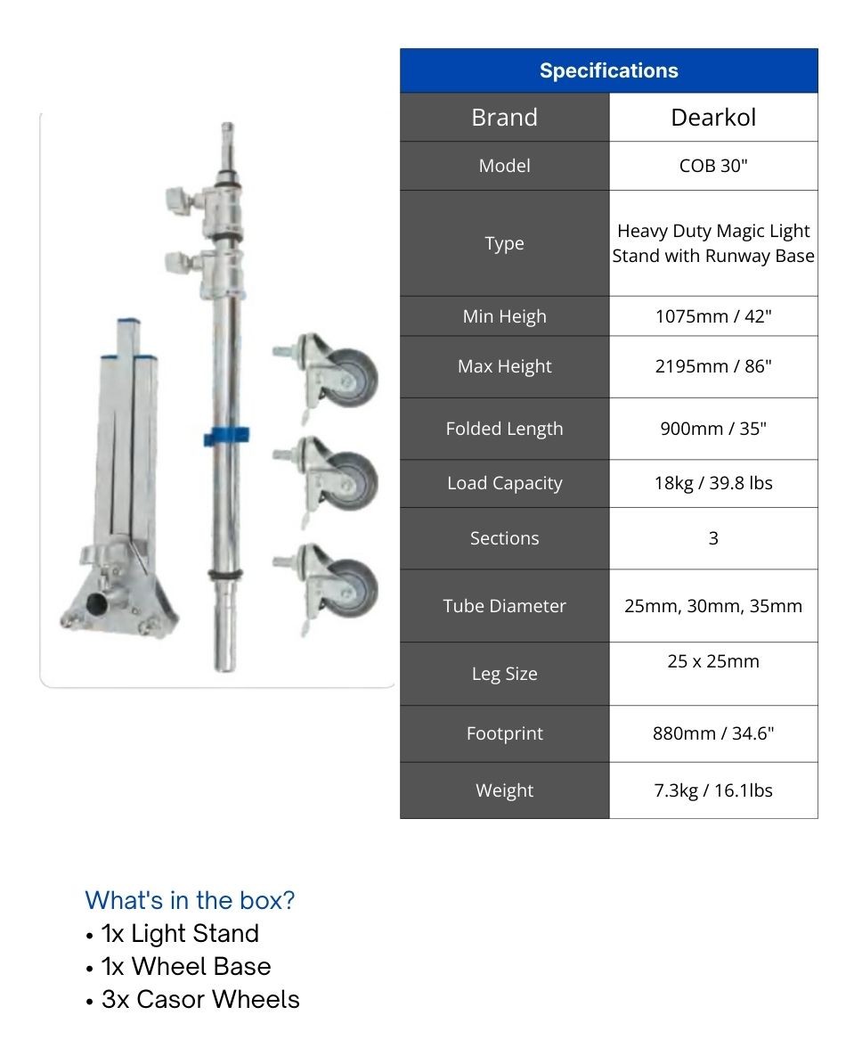 • Type: Heavy Duty Magic Light Stand with Runway Base
