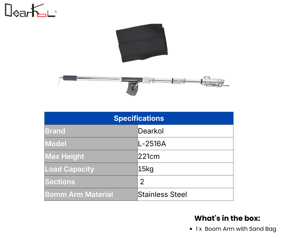 Key Features: Supports up to 15 kg load for heavy lighting equipment Extends to a maximum height of 2210 mm 2-section design for quick setup and stability Built-in sandbag improves balance and safety