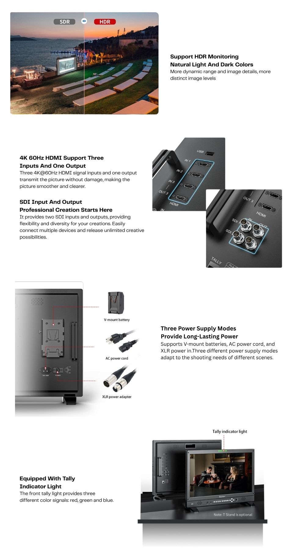 The multiview function allows you to view dual, triple, or quad images on the display. Other features include a waveform tool, a tally light, picture-in-picture mode, a 178° viewing angle, a headphone jack, front speakers, and both horizontal and vertical display modes suitable for social media content. You can power the monitor using the 4-pin XLR power adapter, a standard AC plug, or via the V-mount battery plate on the back. The aluminum case protects the monitor in the field and during transport.