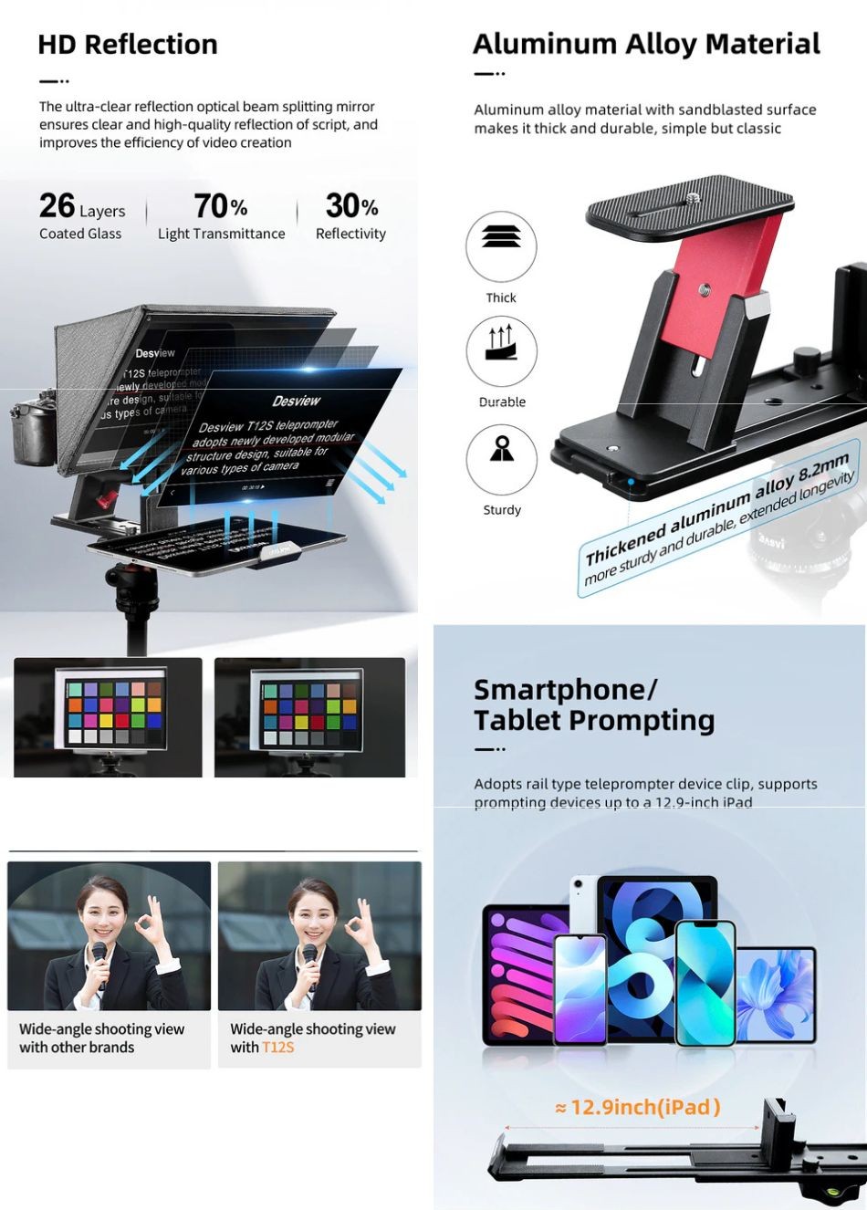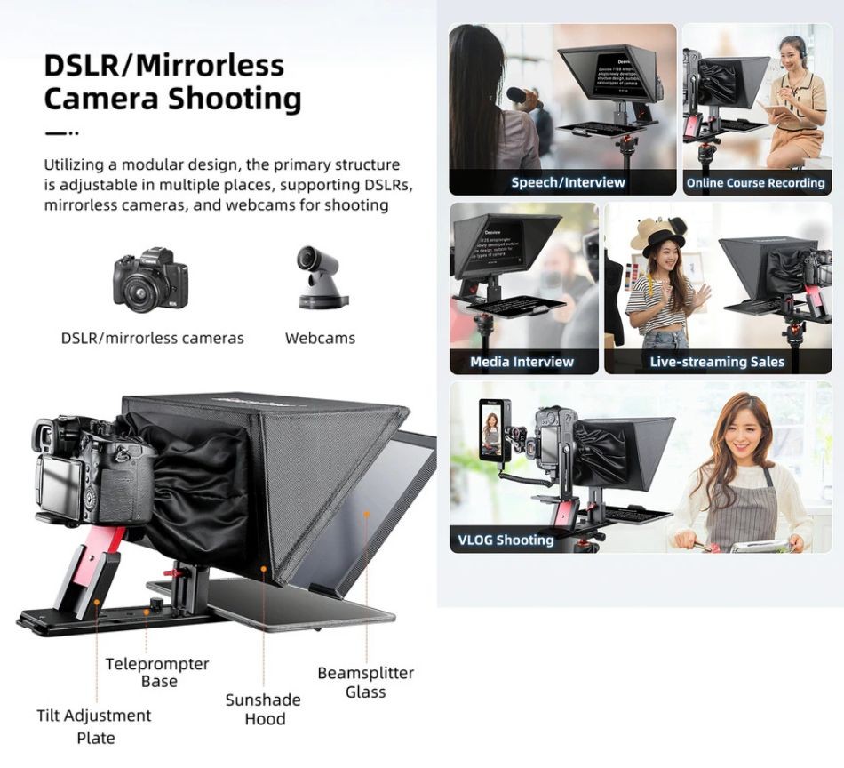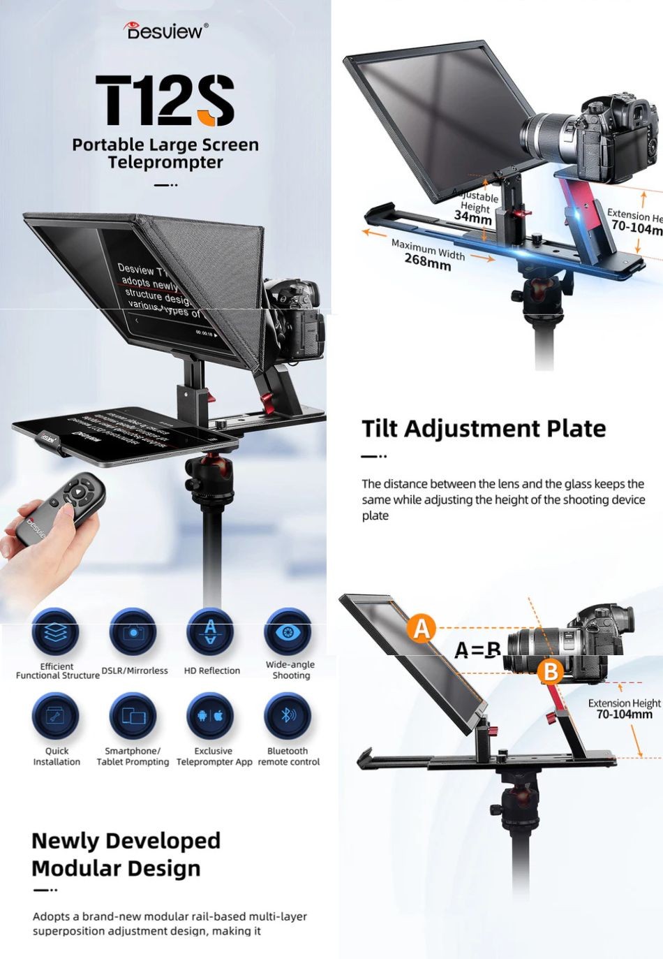 Use a DSLR or mirrorless camera to film content for social media or streaming broadcast with the script-reading capabilities of a teleprompter with the T12S 12.9" Portable Teleprompter for Smartphone/Tablets with Remote Control from Desview. This teleprompter is designed to utilize your smartphone or tablet up to 12.9" in size as your teleprompting source. The teleprompter system is made up of a sun hood, 70/30 beamsplitter glass, an adjustable riser plate, a tablet/smartphone clip, a remote control, a dust cloth, and a travel case to store and transport the full kit.