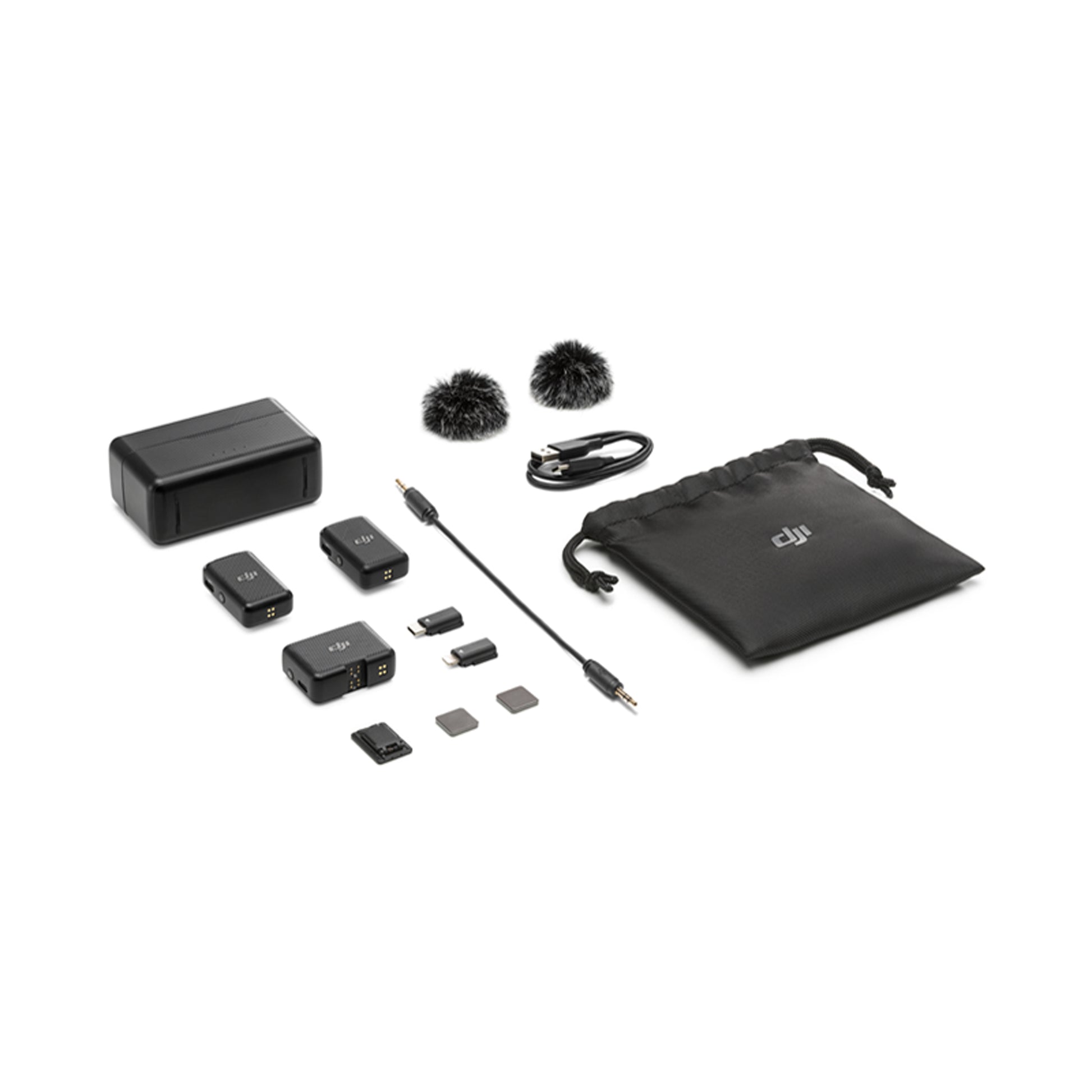 DJI Mic Transmitter x2, DJI Mic Receiver, DJI Mic Charging Case, Carrying Bag, USB-C Charging Cable, Windscreen x2, Mic Clip Magnet x2, Camera Audio Cable (3.5mm TRS), Interchangeable Phone Adapter (Lightning), Interchangeable Phone Adapter (USB-C)