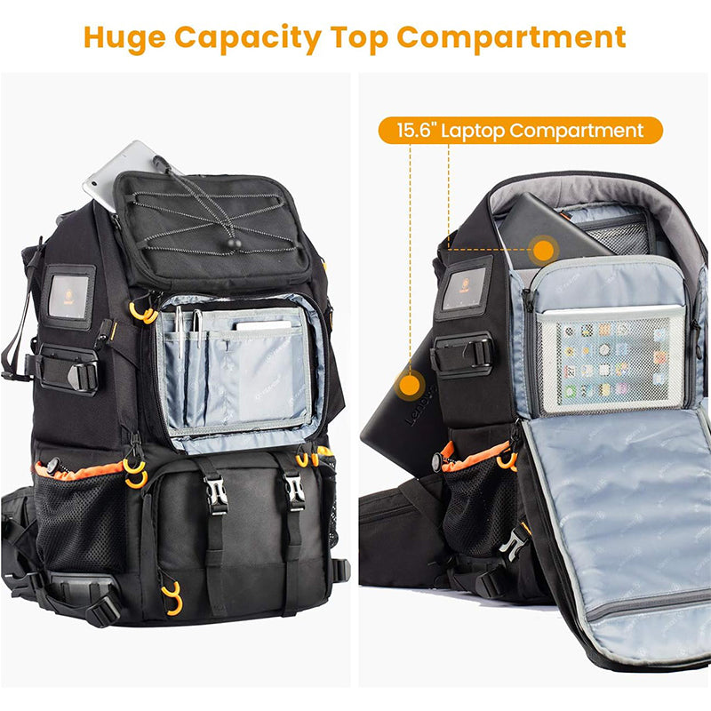 Max 15.6" Laptop Compartment with side zipper can be side accessed. Tripod buckle straps on both sides. Accessories pouches for small devices. Rain Cover attached.