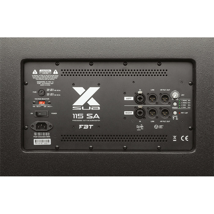 The FBT X-SUB 115SA , 1 x 15" bass-reflex design subwoofer, is the perfect low frequency extension and the ideal companion for the FBT X-LITE and FBT X-PRO series. Frequency response of 42Hz to 120Hz @ -6dB, maximum SPL of 135 dB peak, 1200W Class D amplifier.