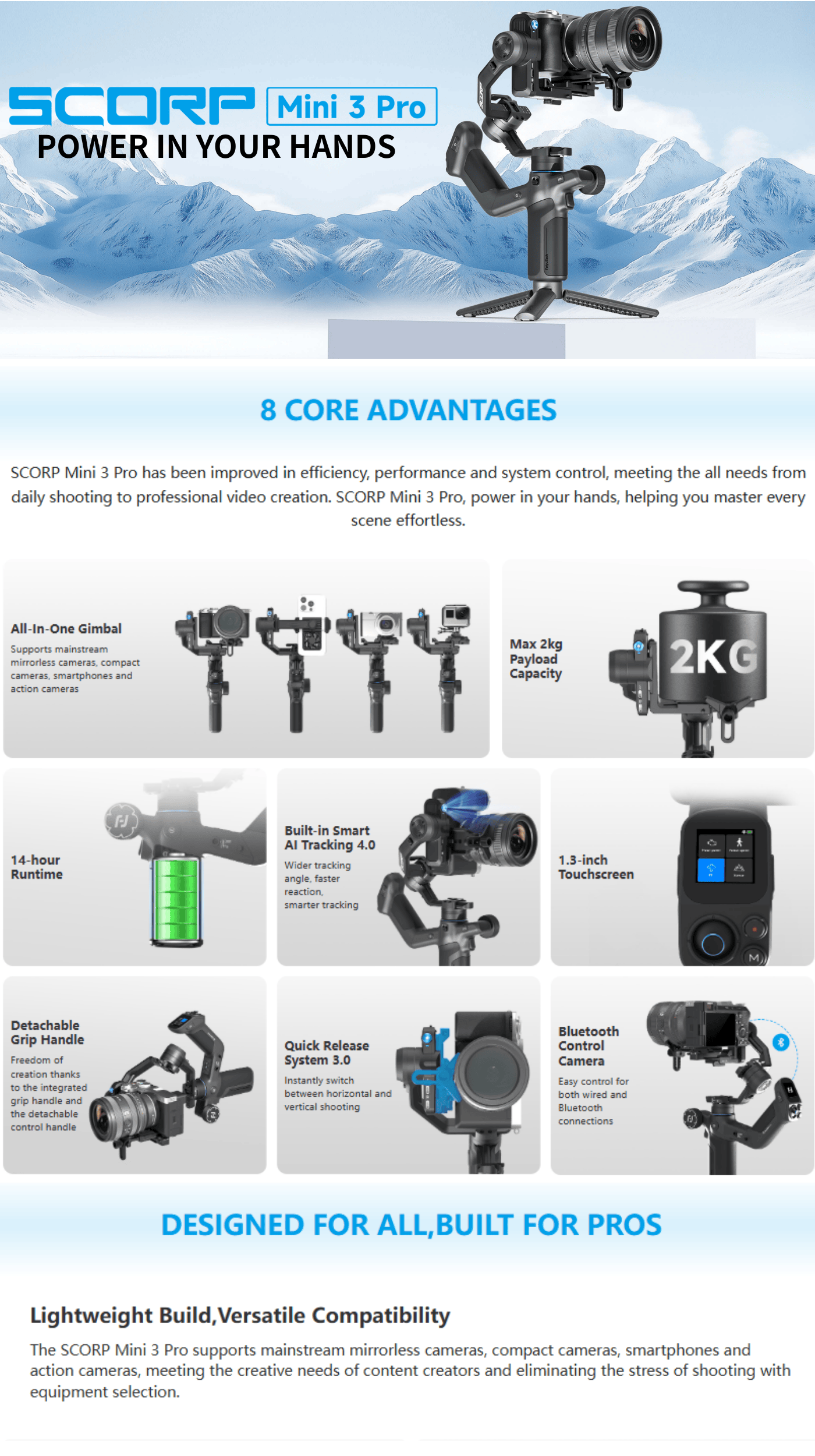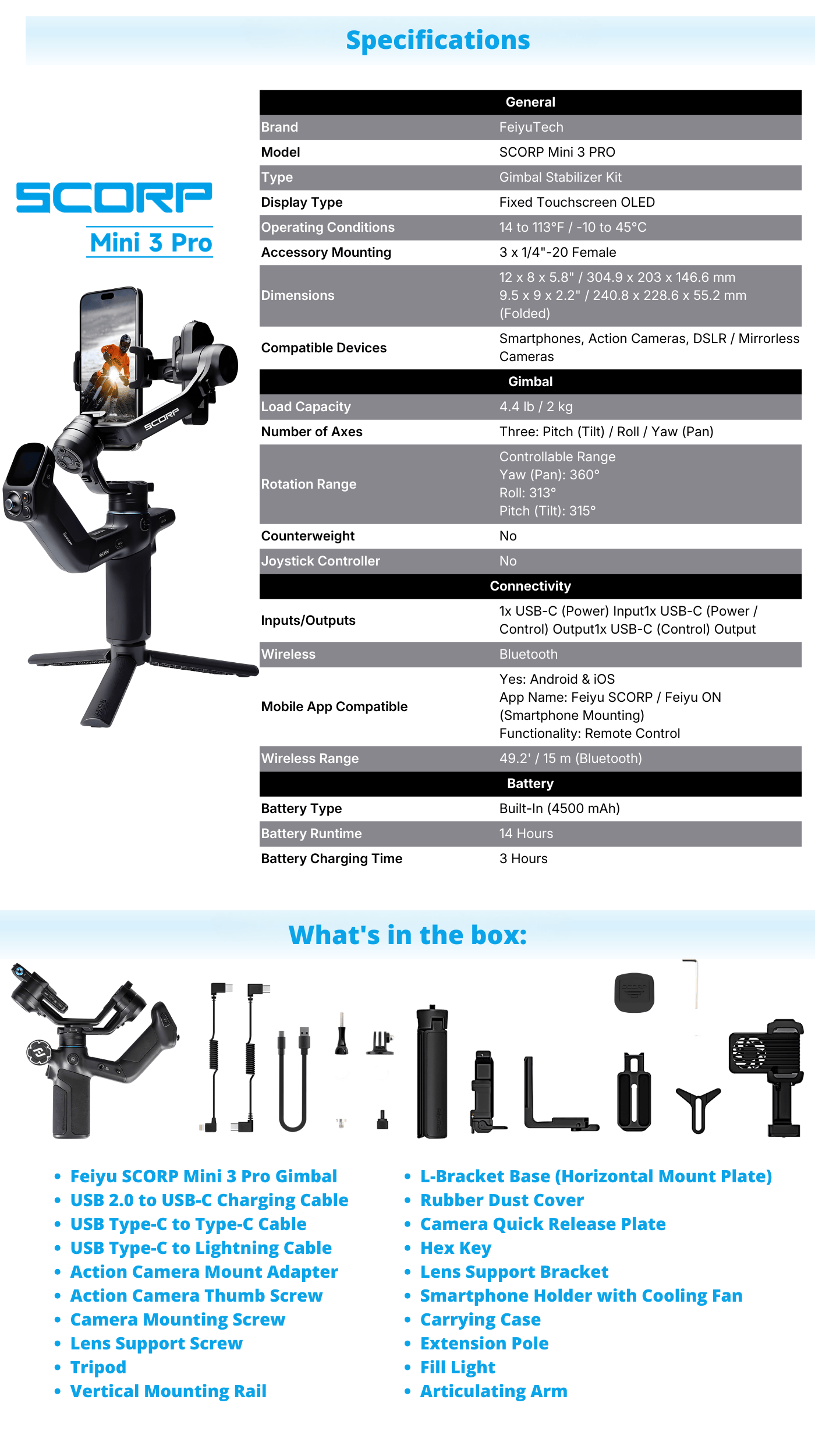 Designed for creators looking for a compact, feature-packed professional gimbal that can stabilize and control an action camera, DSLR, mirrorless camera, or smartphone, Feiyu provides an updated all-in-one solution with the SCORP Mini 3 Pro Gimbal Stabilizer. The SCORP Mini 3 Pro has a detachable grip handle, updated AI tracking, and Bluetooth camera control, and it features a longer battery life, higher payload, enhanced quick release system, and a more responsive touchscreen.