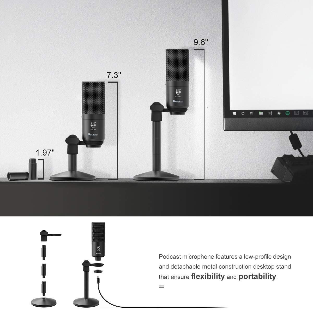 - 【Solid Construction】Vocal microphone with Blue LED for status indication features metal construction.Easy to assemble pc microphone stand with 3 detachable tube heighten from 1.97" to 4.65" ensure flexibility and portability.The thick, heavy base with non-slip rubber feet for stability and vibration dampening.