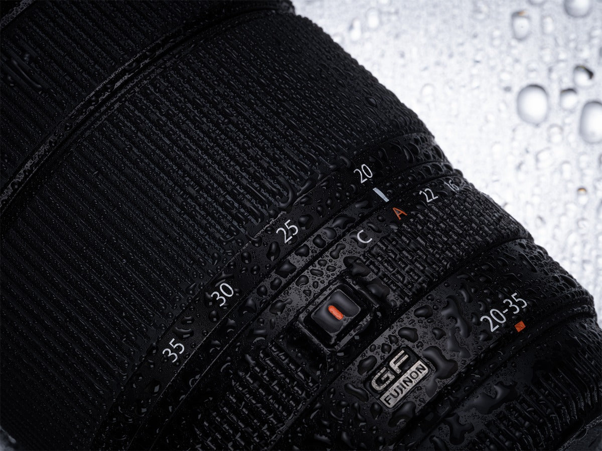 Wide-angle lenses are often used on location, so GF20-35mmF4 R WR has a rugged, weather-resistant design to cope with all conditions. 12 seals protect the lens from dust, moisture and low temperatures down to -10°C (14°F), plus the flourine-coated front element repels water, fingerprints, and dust making it easier to clean.