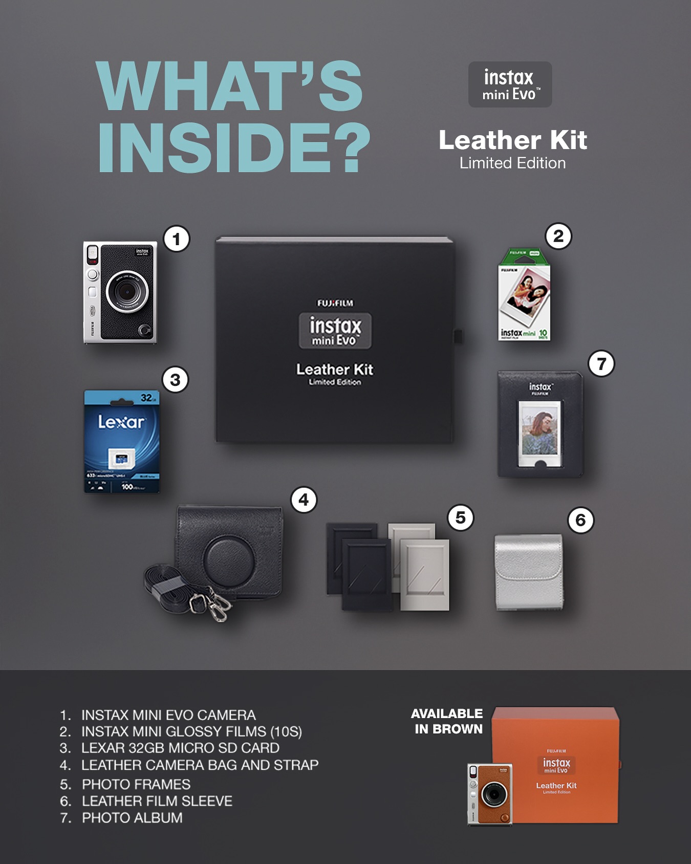 Mini Evo combines classic form with modern function, offering a variety of features that INSTAX users have come to expect, with a few new twists. This camera features 10 lens modes and 10 filter options, offering 100 different combinations for users to express themselves.