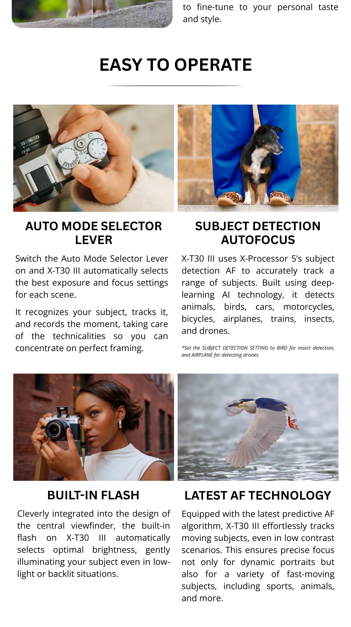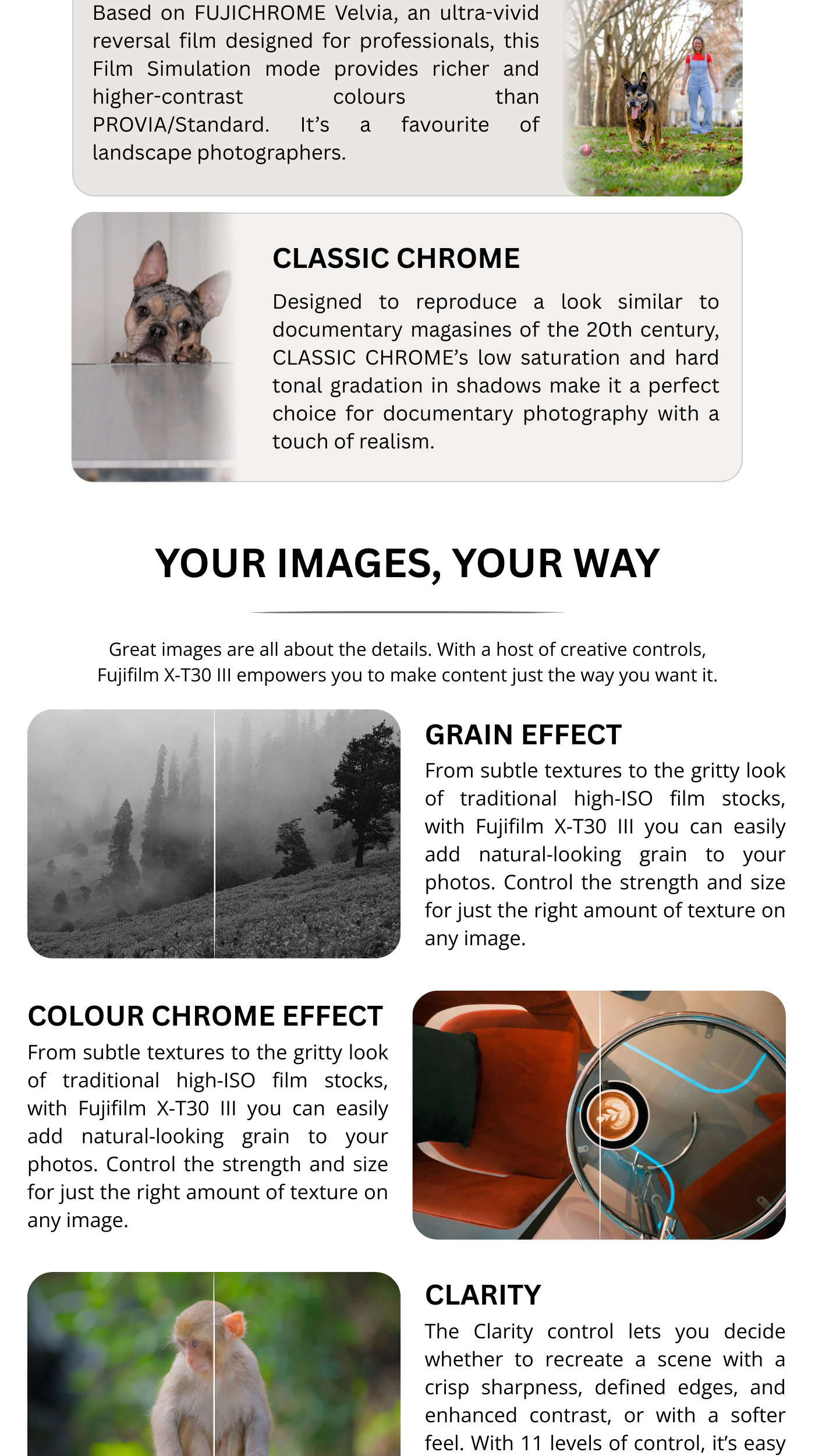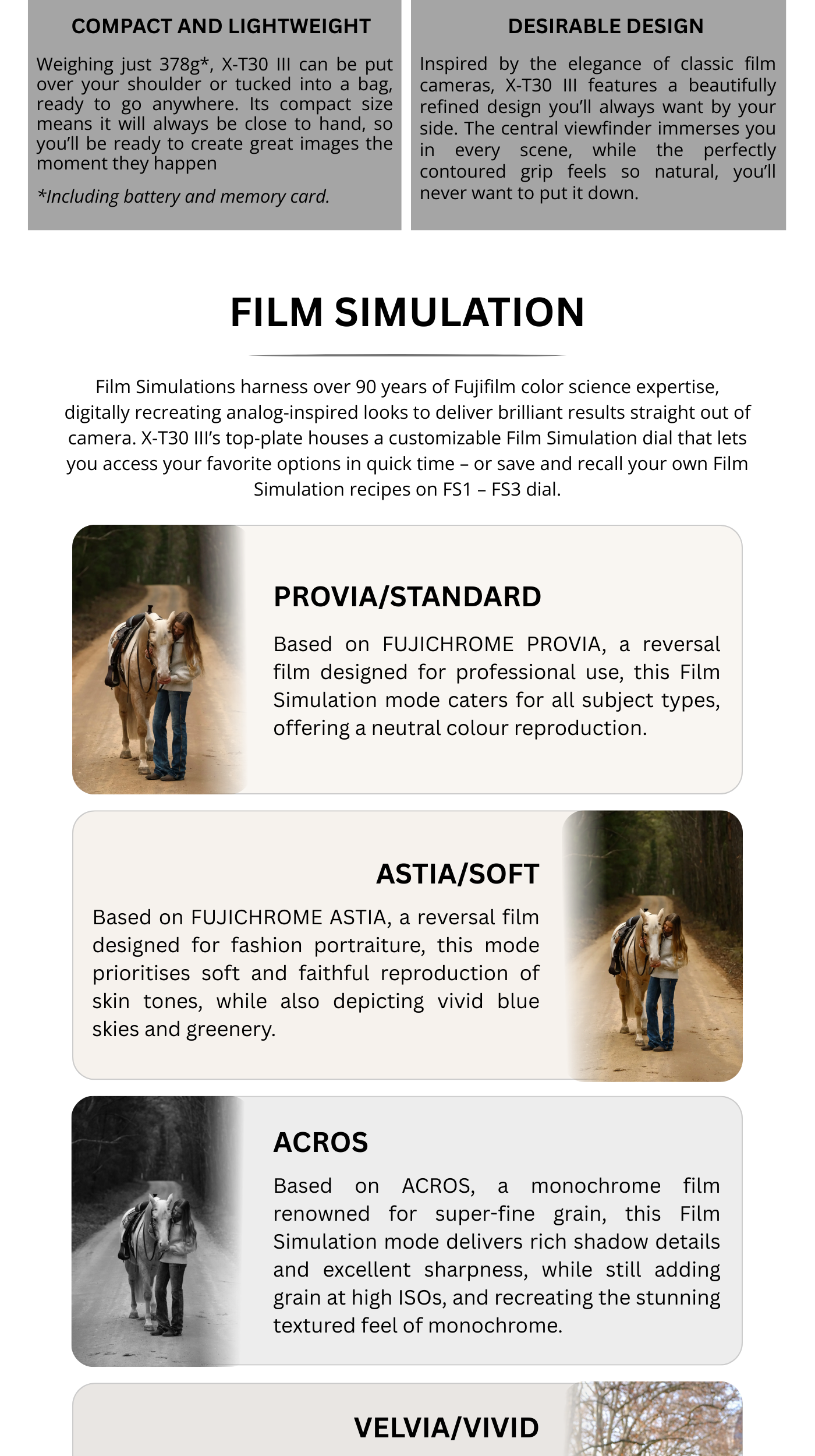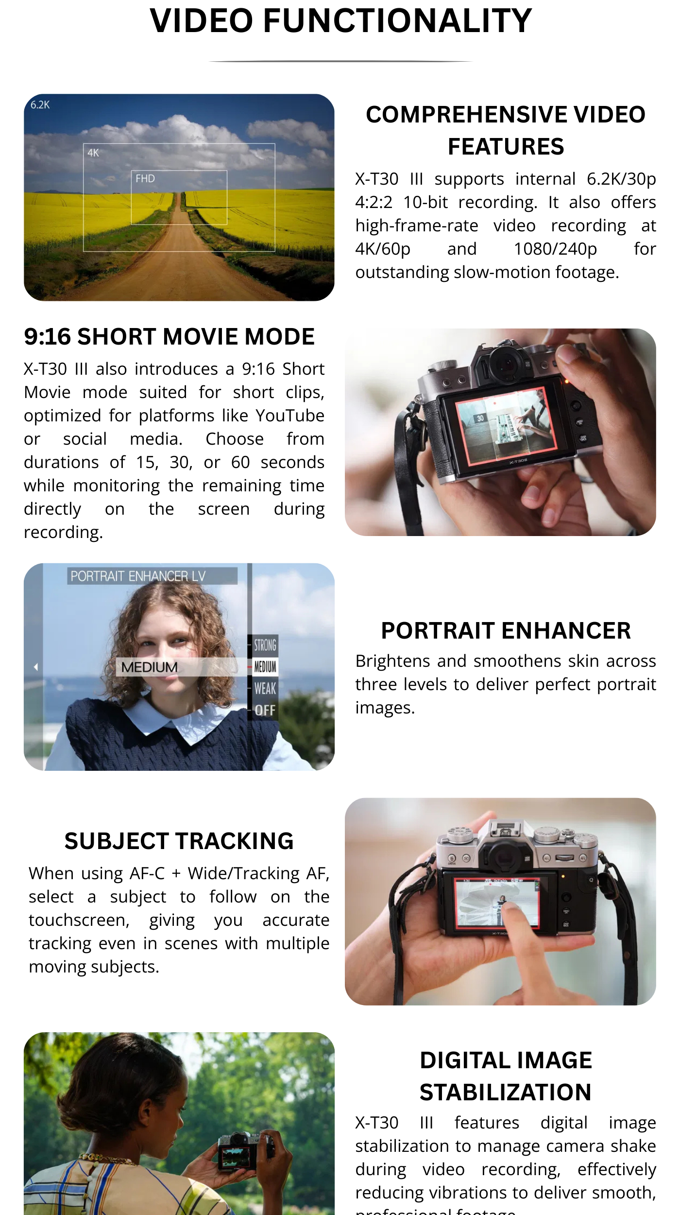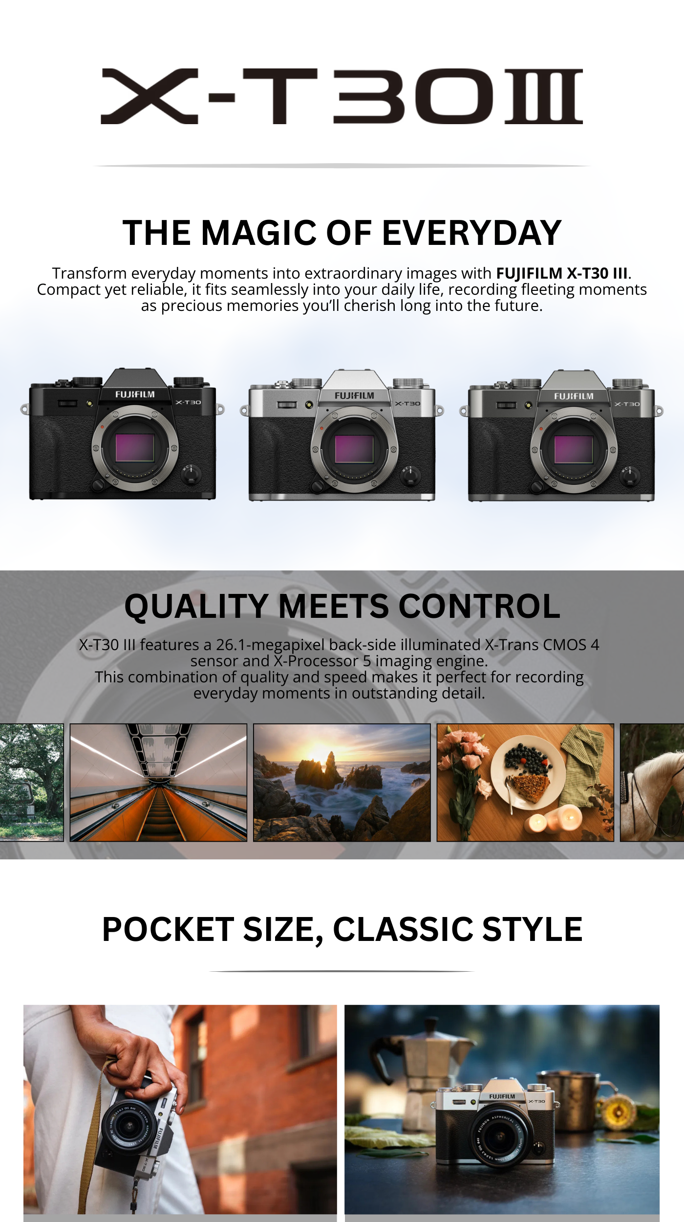 The FUJIFILM X-T30 III is the latest compact, retro-styled mirrorless camera body from Fujifilm, now featuring a powerful 26.1MP APS-C sensor and an advanced image processor. It’s small, lightweight, and designed for creatives who want premium image quality and 6.2K video without bulk. With tactile dials, a customizable Film Simulation dial, and AI-enhanced autofocus, it’s ideal for photography enthusiasts, content creators, and travelers alike. Whether you shoot street, portraits, landscapes or video, the X-T30 III gives you flexibility, quality, and the timeless Fuji aesthetic.