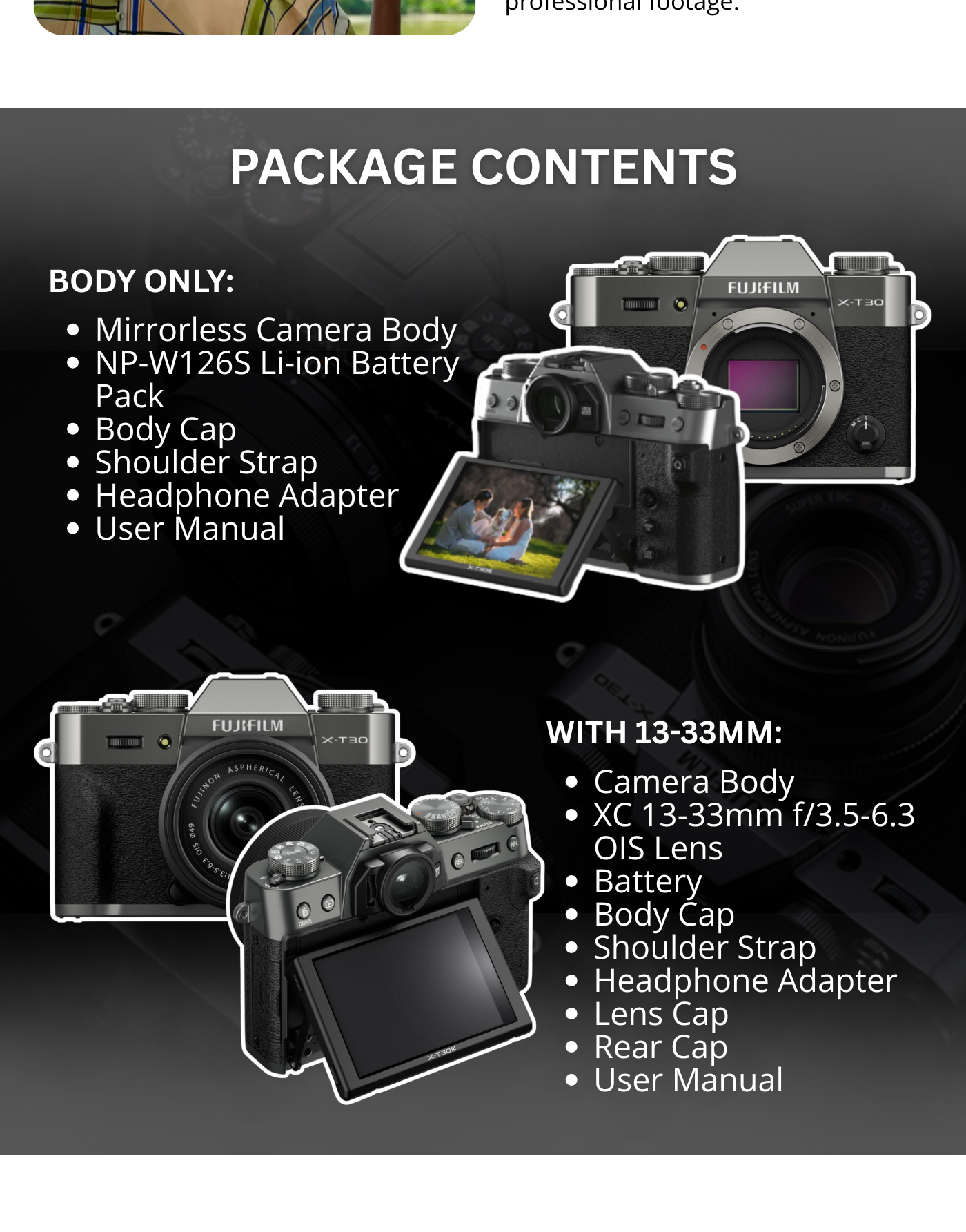 The FUJIFILM X-T30 III is the latest compact, retro-styled mirrorless camera body from Fujifilm, now featuring a powerful 26.1MP APS-C sensor and an advanced image processor. It’s small, lightweight, and designed for creatives who want premium image quality and 6.2K video without bulk. With tactile dials, a customizable Film Simulation dial, and AI-enhanced autofocus, it’s ideal for photography enthusiasts, content creators, and travelers alike. Whether you shoot street, portraits, landscapes or video, the X-T30 III gives you flexibility, quality, and the timeless Fuji aesthetic.