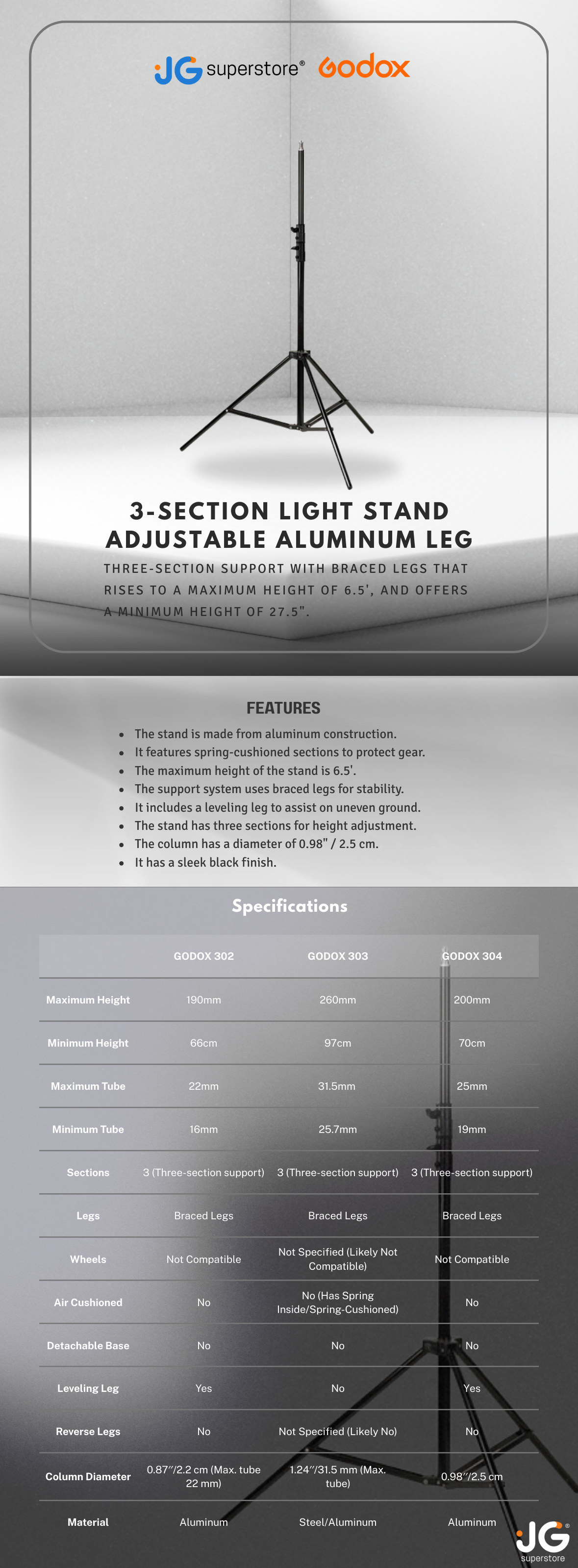 Godox 302 / 303 / 304 3-Section Aluminum Studio Light Stand with 260CM Max Height, Spring Load Locking T-Knobs and Universal Spigot for Studio and Lighting Equipment