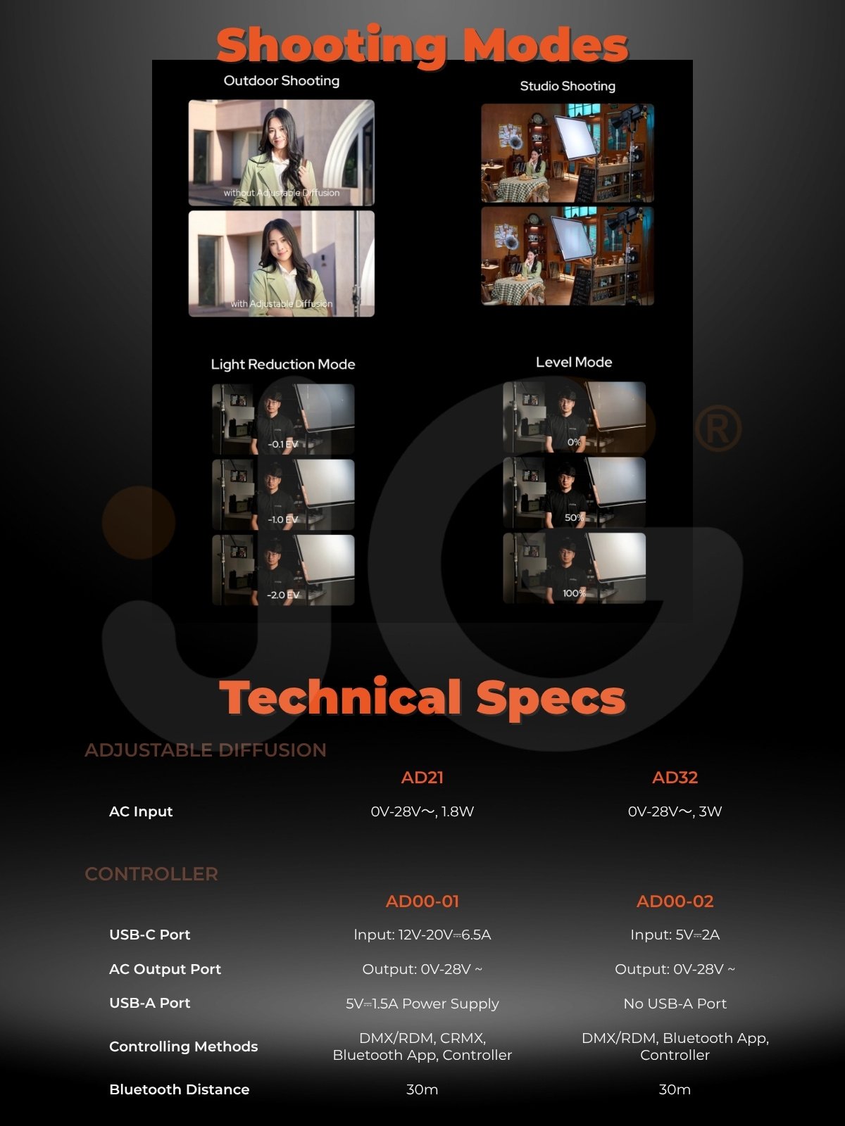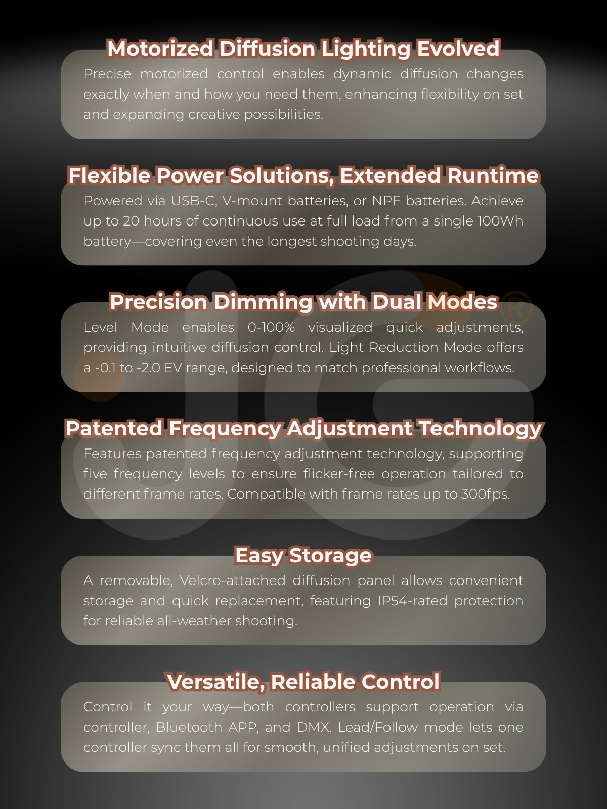 Motorized Diffusion Control: Transform between hard shadows and soft diffusion instantly via electronic adjustment.