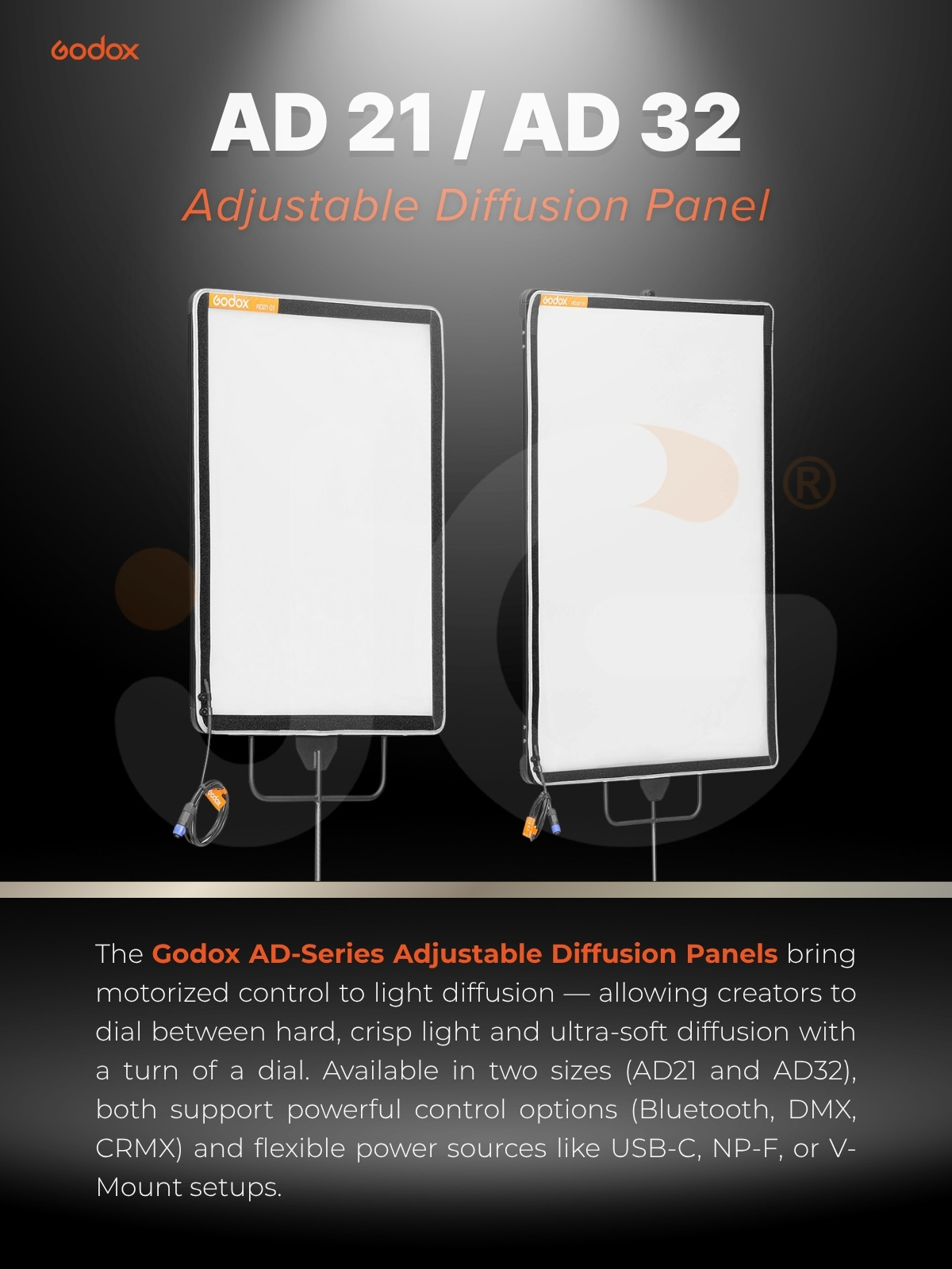 Godox AD21 / AD32 K2 Adjustable Light Diffusion Panel with Motorized Control, Dual Dimming Modes, Bluetooth App, DMX/RDM & Built-in CRMX, Controller Powered via USB-C / V-Mount Battery for Photography, Video & Studio Lighting