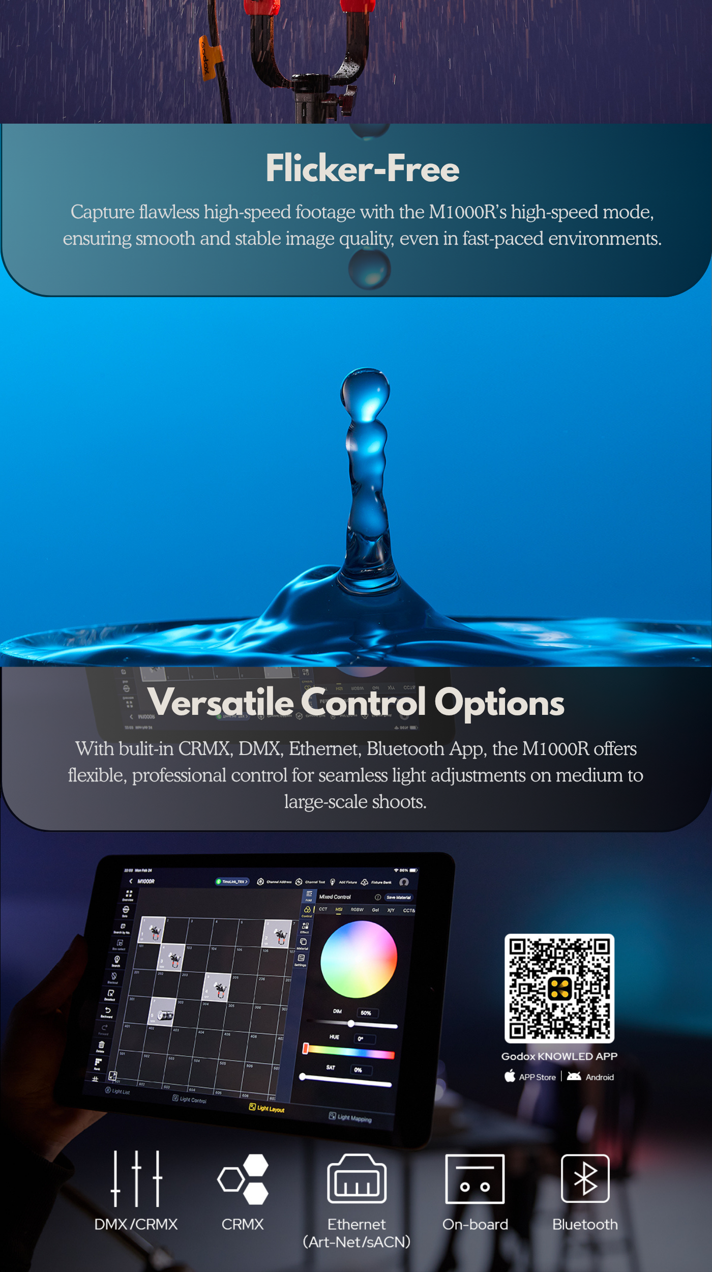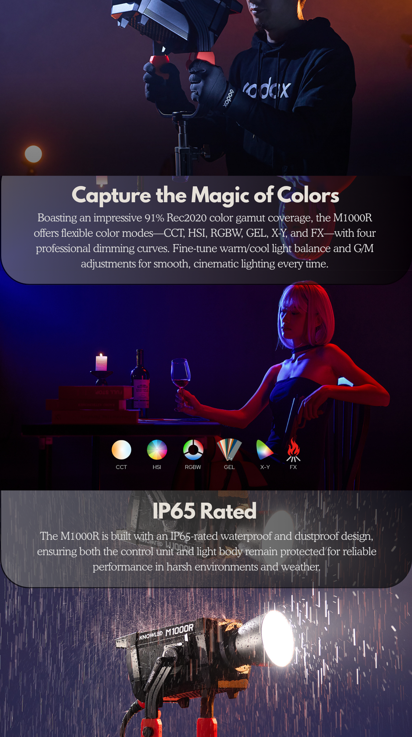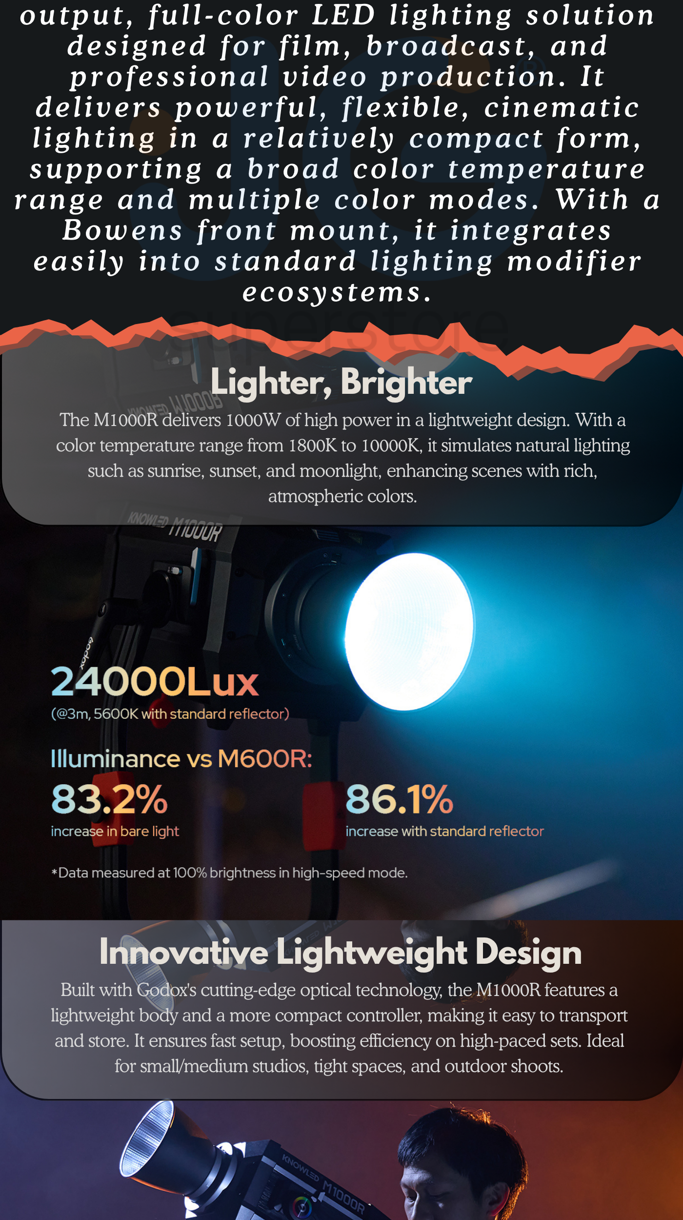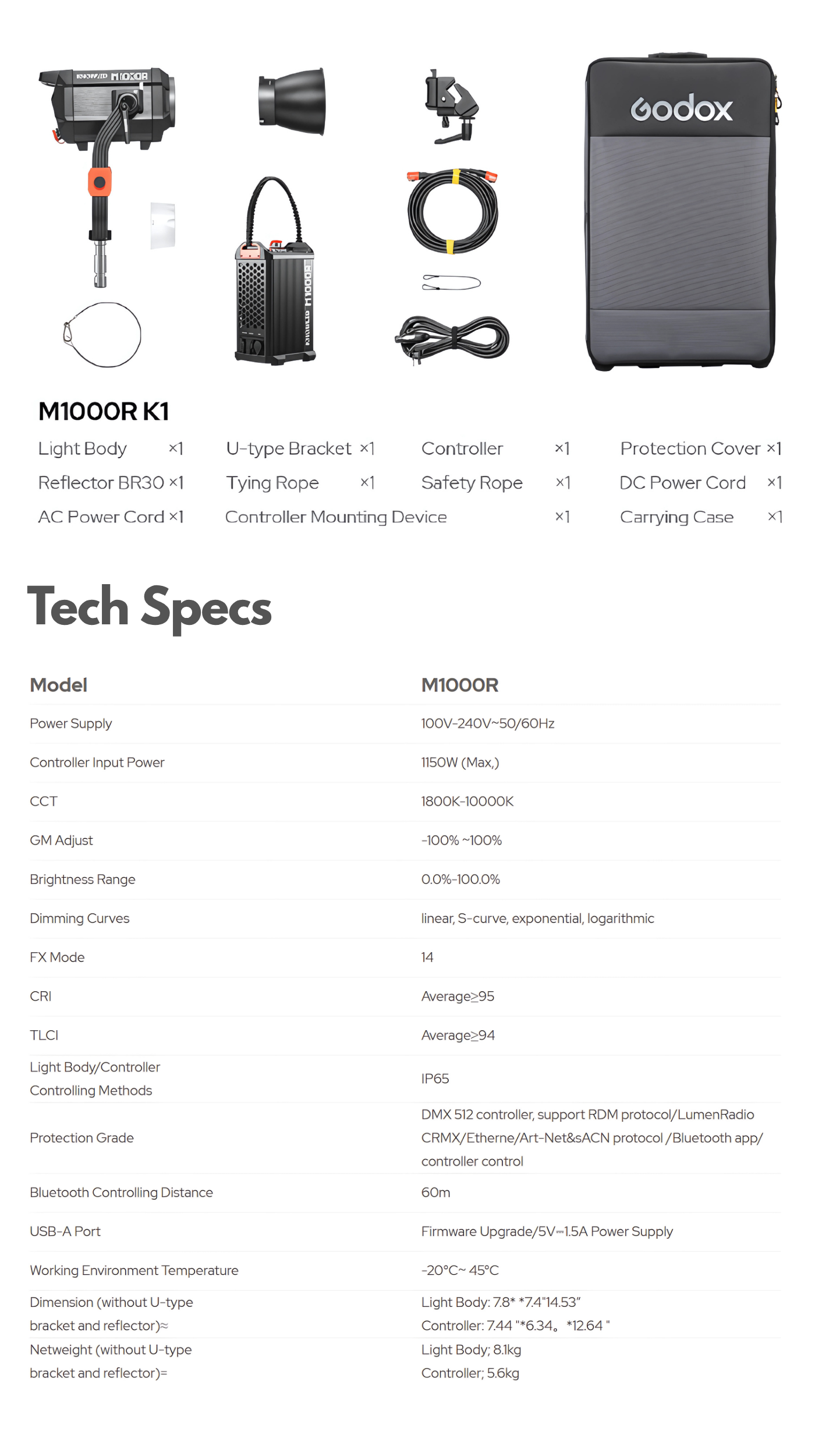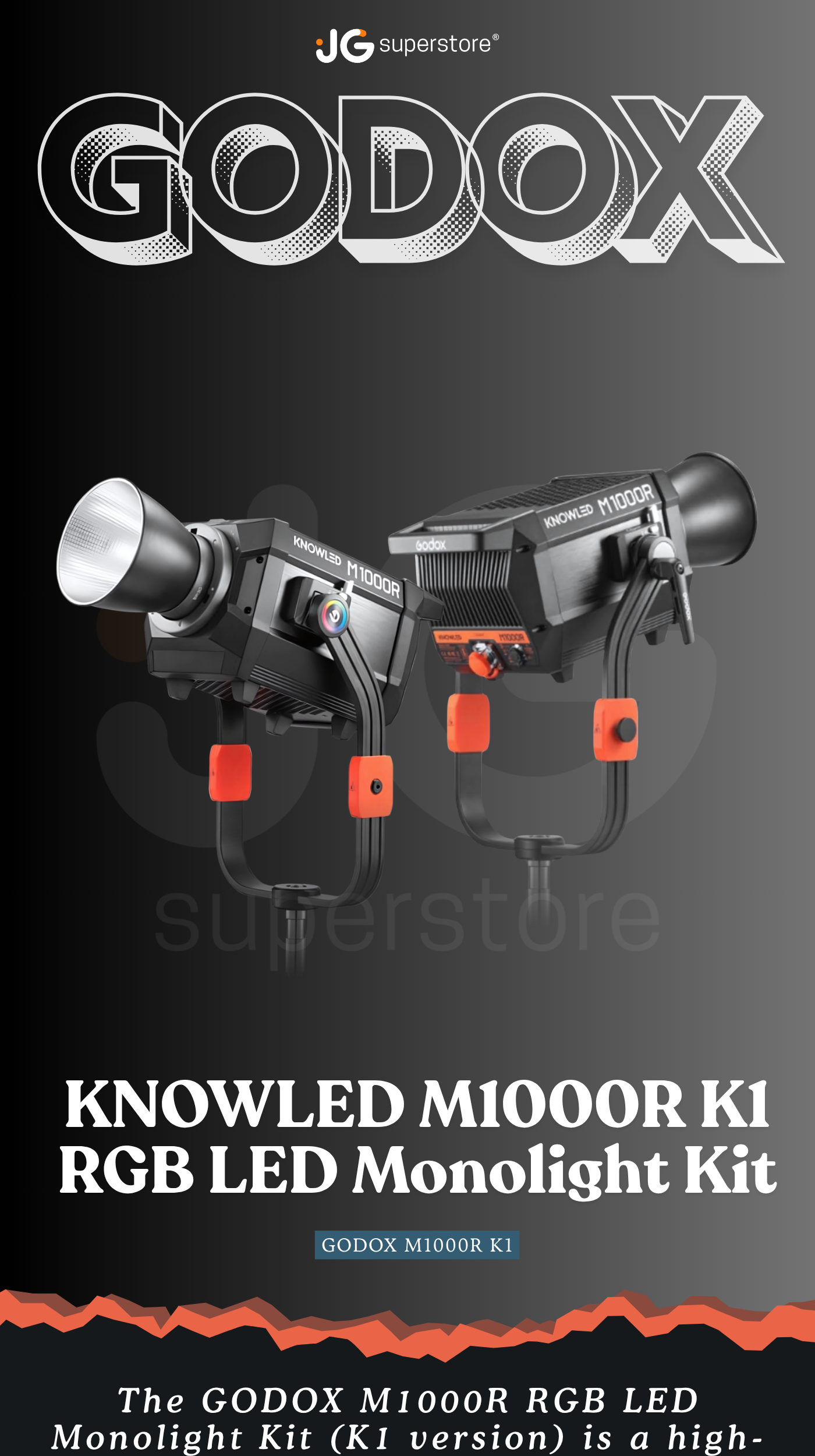 The GODOX M1000R RGB LED Monolight Kit (K1 version) is a high-output, full-color LED lighting solution designed for film, broadcast, and professional video production. It delivers powerful, flexible, cinematic lighting in a relatively compact form, supporting a broad color temperature range and multiple color modes. With a Bowens front mount, it integrates easily into standard lighting modifier ecosystems. The kit includes the light head, controller, reflector, mounting bracket, power cables, safety accessories, and a carrying case, making it ready for both studio and location use.
