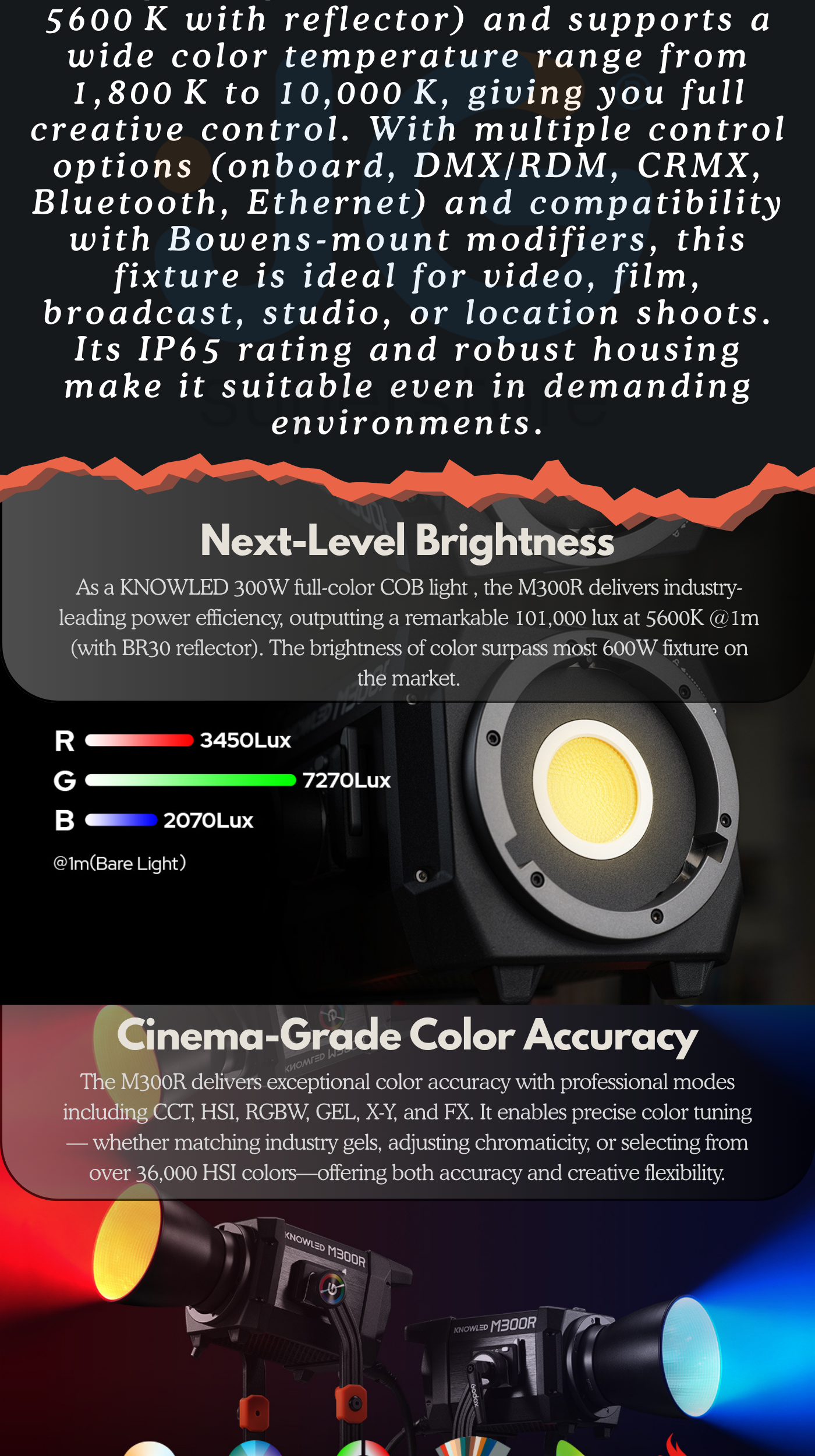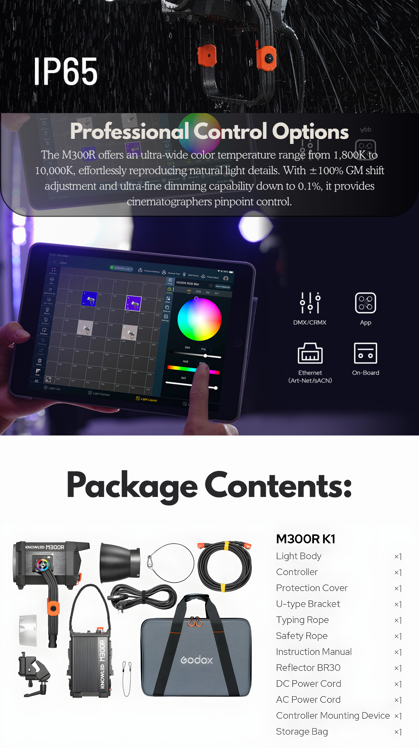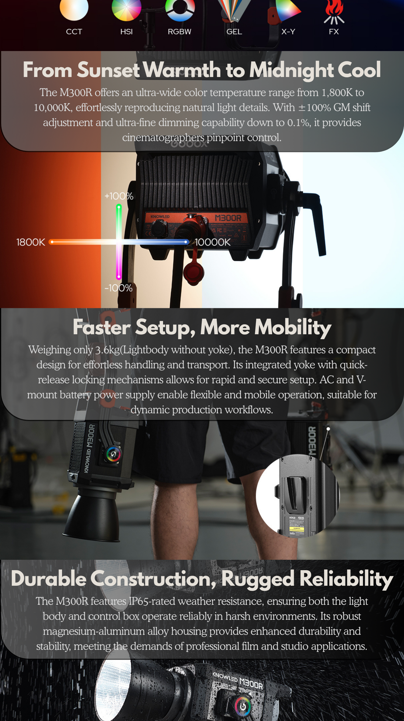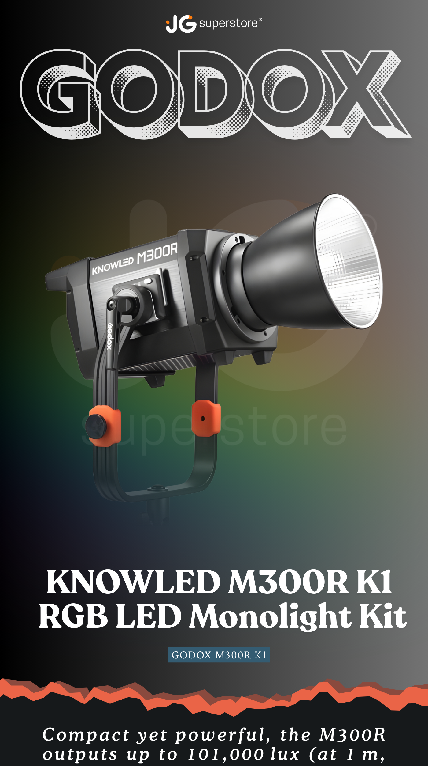 Elevate your lighting game with the Godox KNOWLED M300R K1 — a 300 W full‑color COB LED monolight that combines cinema-grade color fidelity, flexible control modes, and rugged reliability — all packaged in a modular, production-ready system.